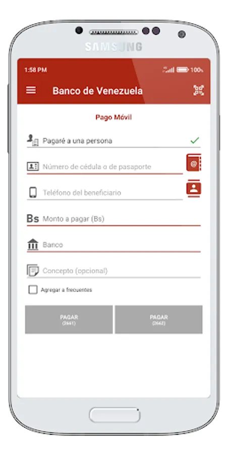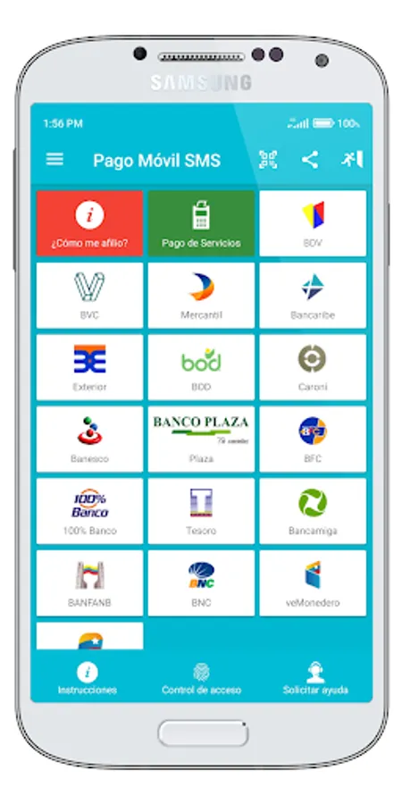 We integrate the services of 13 banks that have the Mobile Payment service by text message: 100% Banco, Bancamiga, Bancaribe, Banesco, BANFANB, BFC, BNC, Caroní, Exterior (only in the version without advertising), Mercantil, Tesoro, Venezuela and Venezuelan Credit.