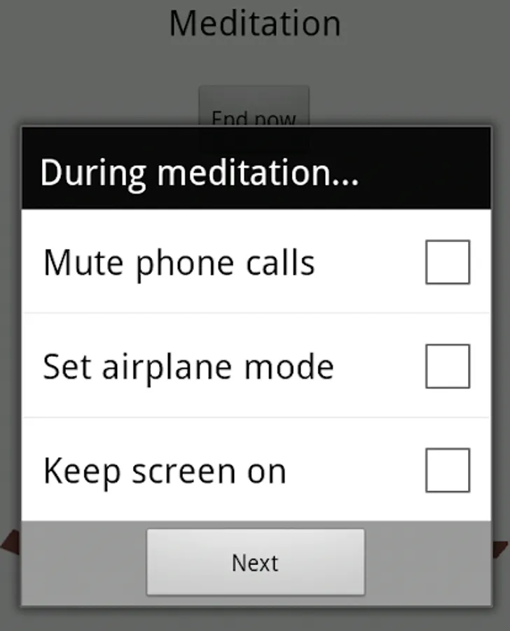 During meditation, you can choose to mute phone calls, enter airplane mode or keep the screen active. The app will restore the state automatically at the end of the meditation.