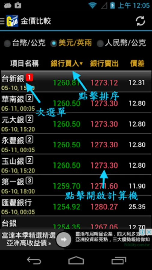 @[[金價比較/排序],可將各銀行的金價作排序 (點擊買進/賣出欄位表頭),迅速找出報價較優惠之銀行。