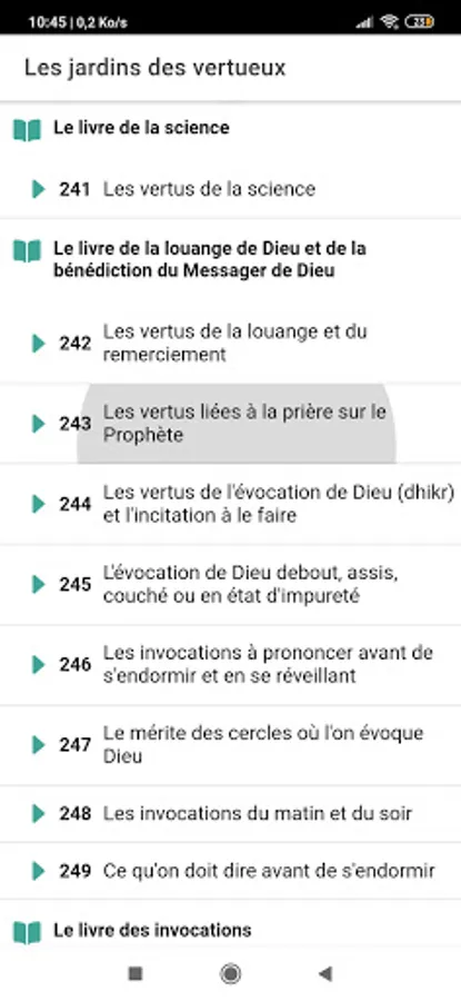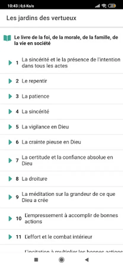 The book is composed of 20 themes dealing with different aspects of the virtuous behavior of the Muslim in himself, in society and towards God.