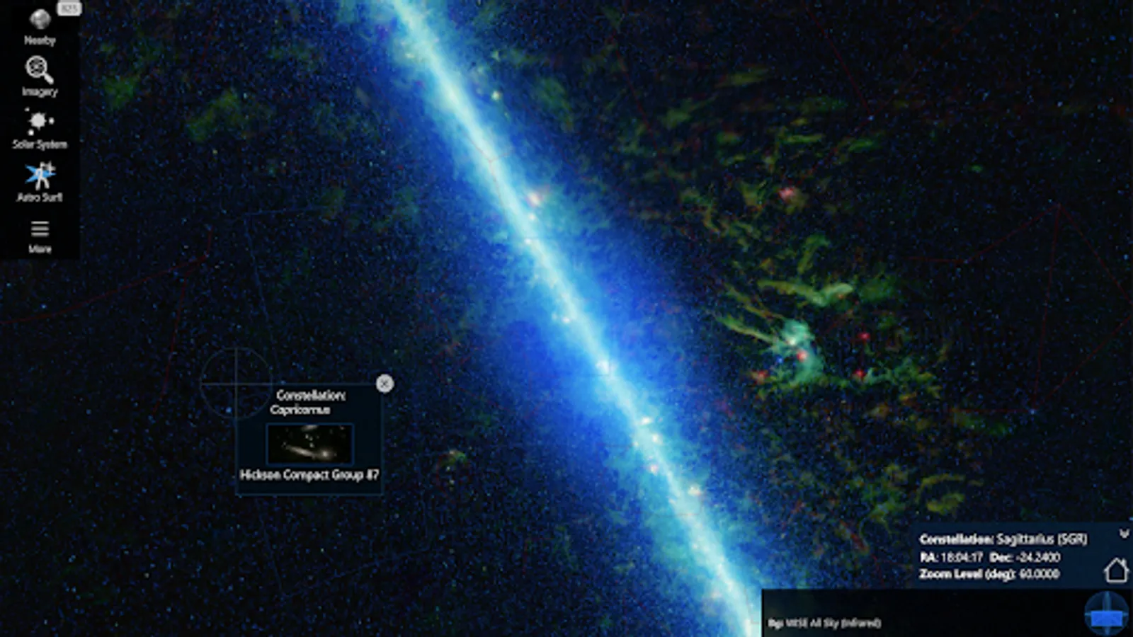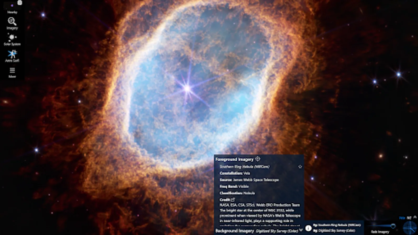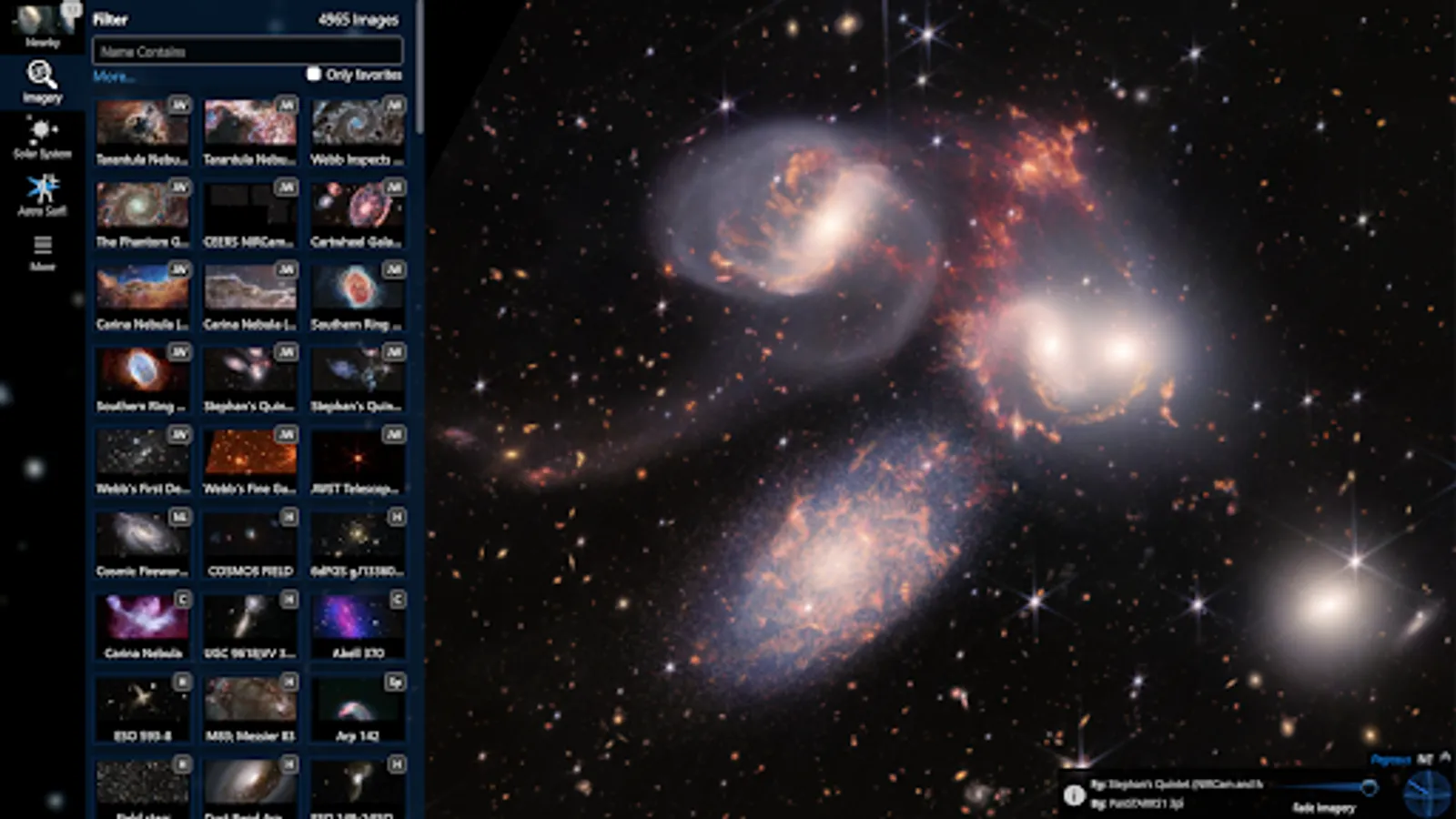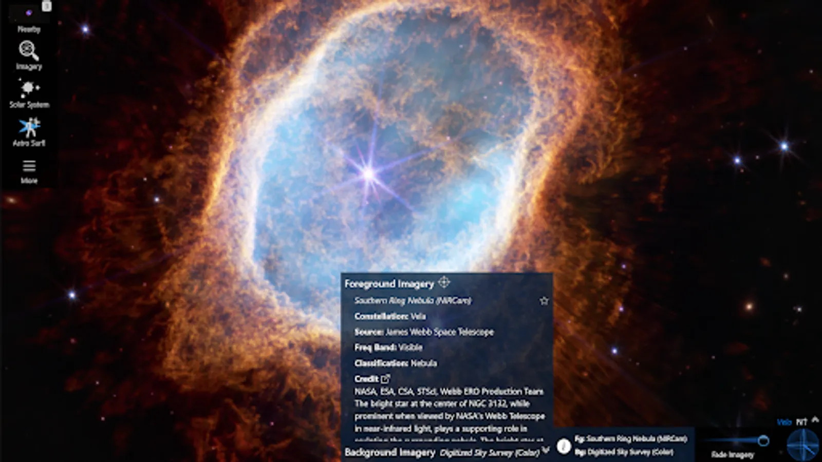 A huge repository of astronomy imagery from James Webb, Hubble, Spitzer, and other Earth and Space-based telescopes with regular updates so you always have access to the latest imagery being released and published. View the sky with 44 different backgrounds in various wavelengths like x-ray, infrared, gamma, and microwave. You will be able to pan the night sky and see details about over 5500 high-resolution images.