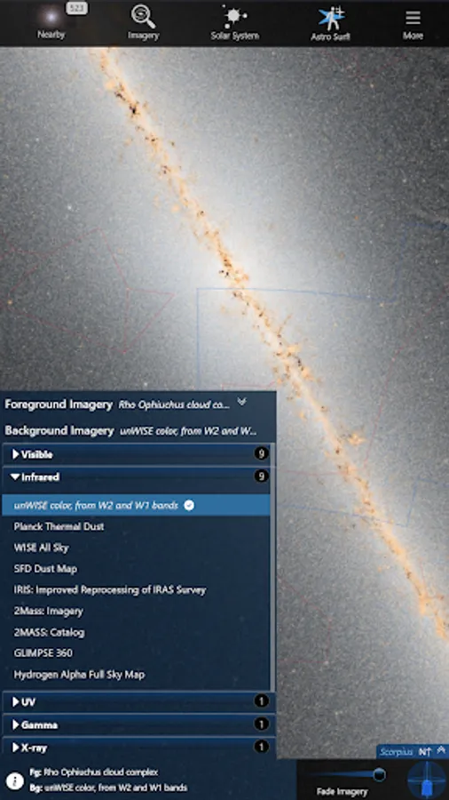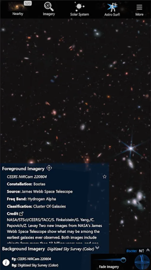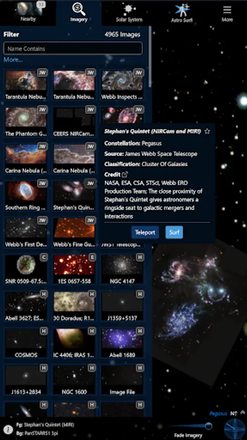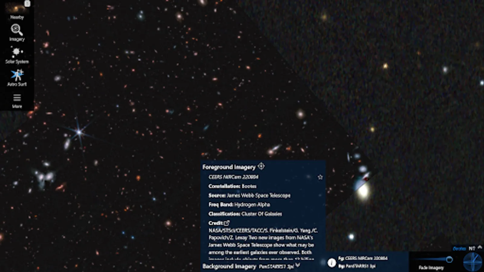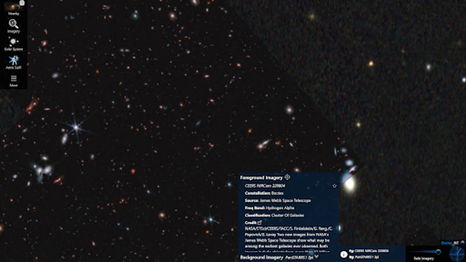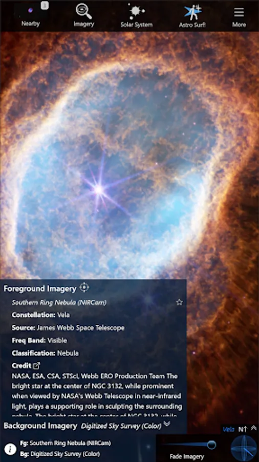A huge repository of astronomy imagery from James Webb, Hubble, Spitzer, and other Earth and Space-based telescopes with regular updates so you always have access to the latest imagery being released and published. View the sky with 44 different backgrounds in various wavelengths like x-ray, infrared, gamma, and microwave. You will be able to pan the night sky and see details about over 5500 high-resolution images.