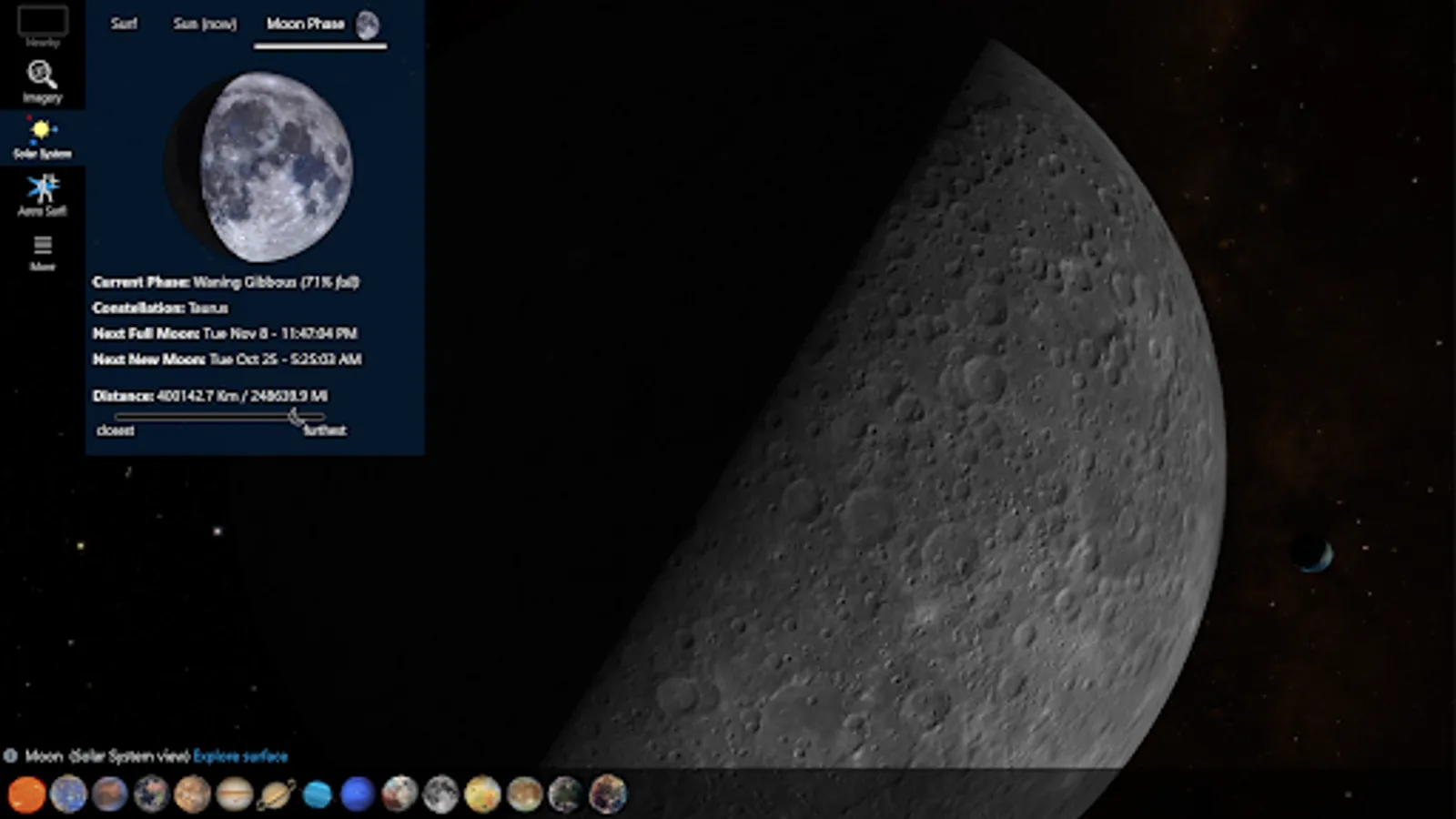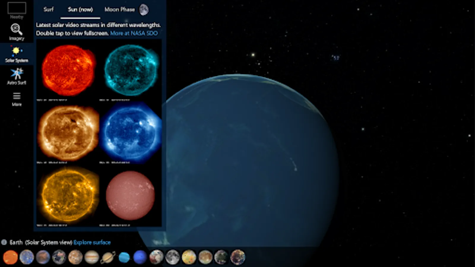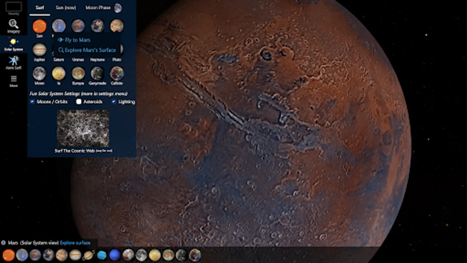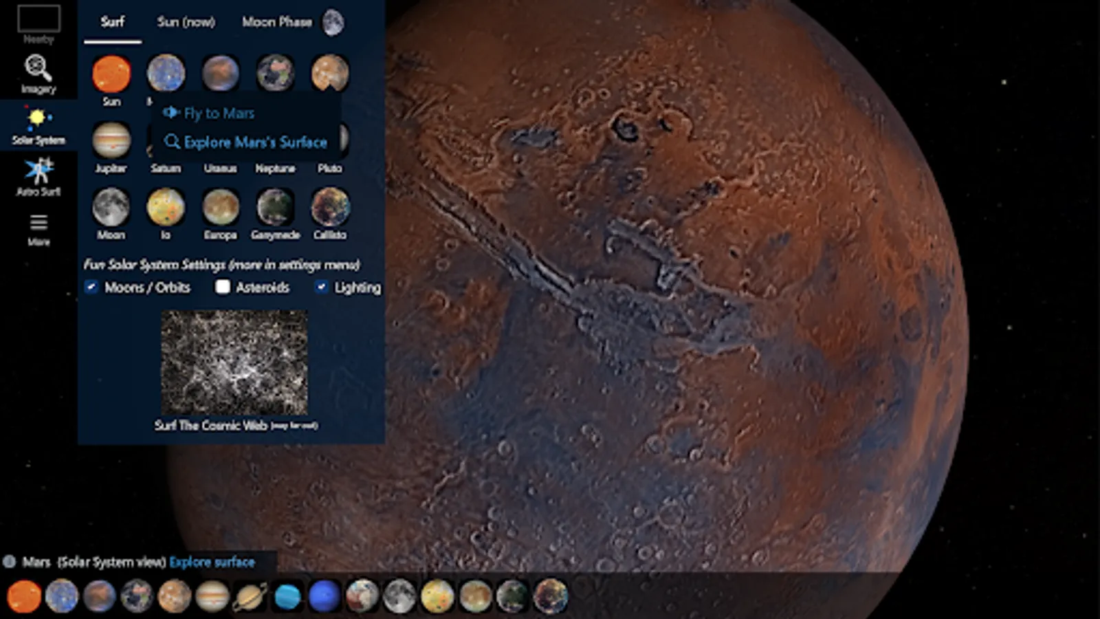 You can explore the surface of all the planets, our moon, and even see the asteroids and minor planets and their positions.