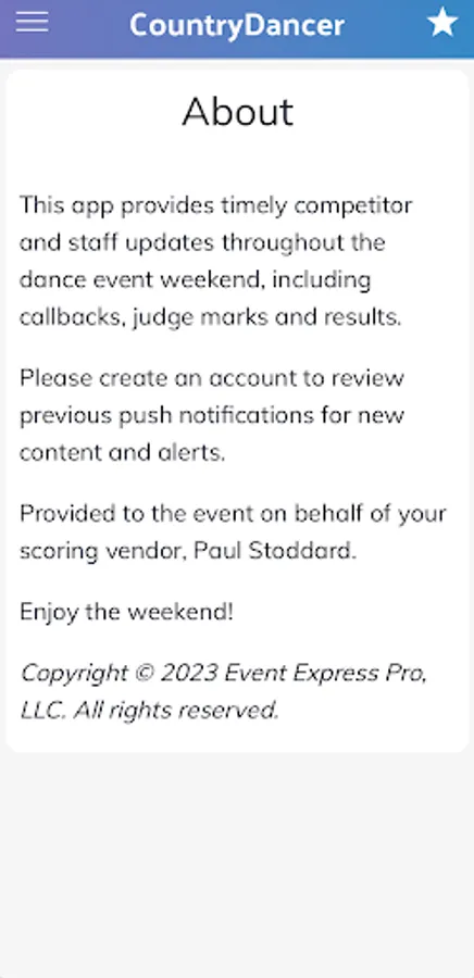 This app provides timely competitor and staff updates throughout the country dance event weekend, including heat sheets, callbacks, judge marks and results.