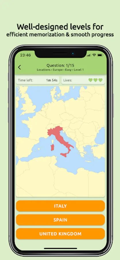- You decide what to learn: choose from flags, capital cities, maps and locations on the world map, and currencies.
