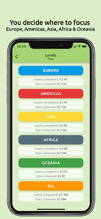 Before you start a level, you need to choose what you want to learn, and which continent you want to focus on (Europe, Americas, Asia, Africa, or Oceania), as well as the difficulty of the levels (see below). Of course, if you already have a very good knowledge of the countries, you can choose to mix everything including the learning content and the continents.