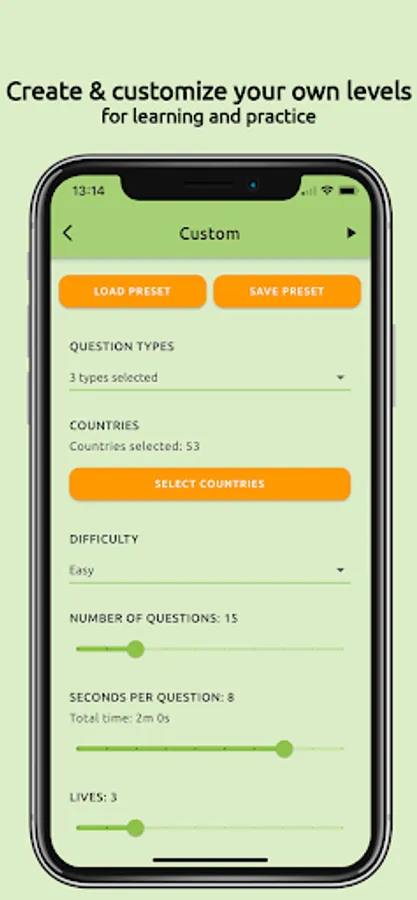 - Customize your own levels (what to learn, which countries and how difficulty).