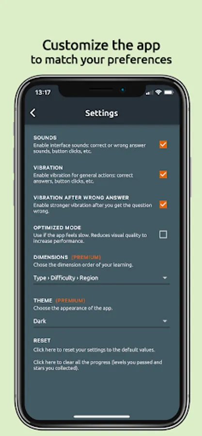 - Easily configure the game: enable/disable sounds, reset the progress, and more.