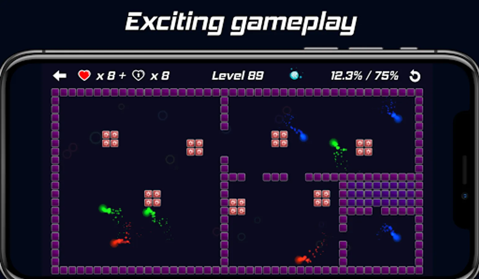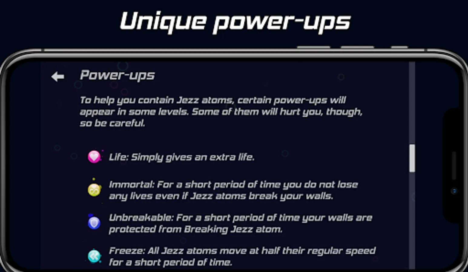 - Immortal: For a short period of time you do not lose any lives even if Jezz atoms break your walls.
