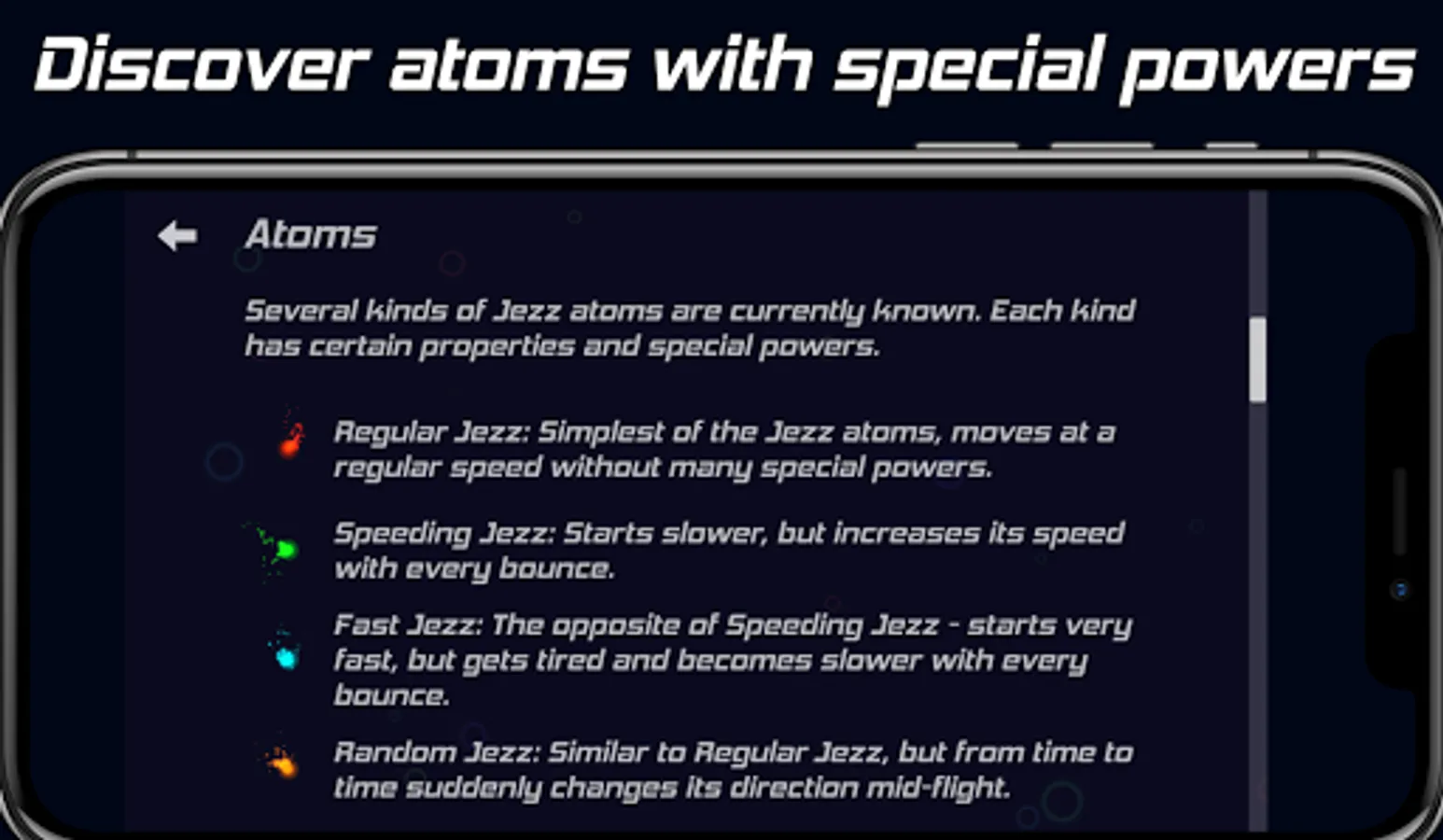 Several kinds of Jezz atoms are currently known. Each kind has certain properties and special powers.