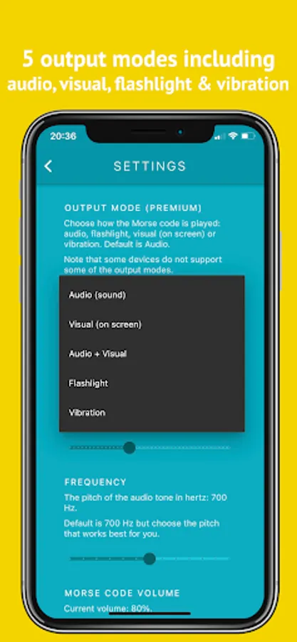 - 5 output modes: audio (default), blinking light, flashlight, vibration and light + sound.