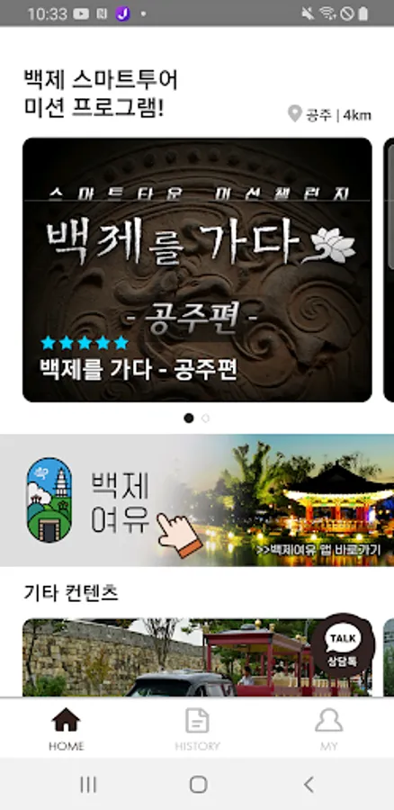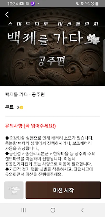 'Smart Town Mission Challenge_ Go to Baekje' is a new concept smart tour program that allows visitors to experience interesting augmented reality (AR) content and cultural heritage through missions while moving around the Gongju and Buyeo cultural heritage landmarks.