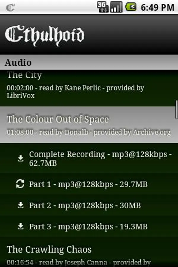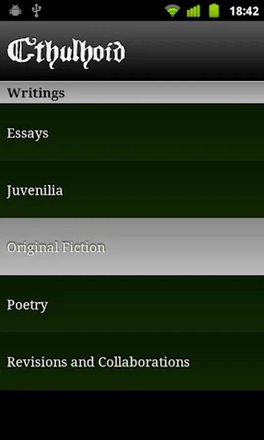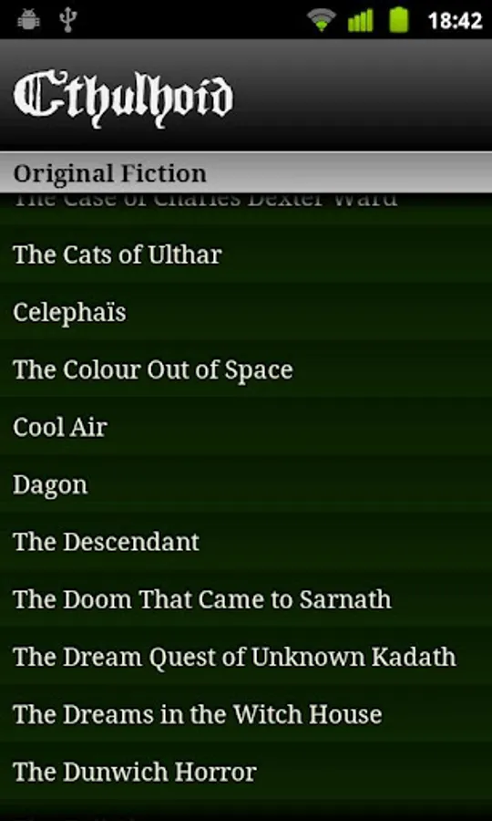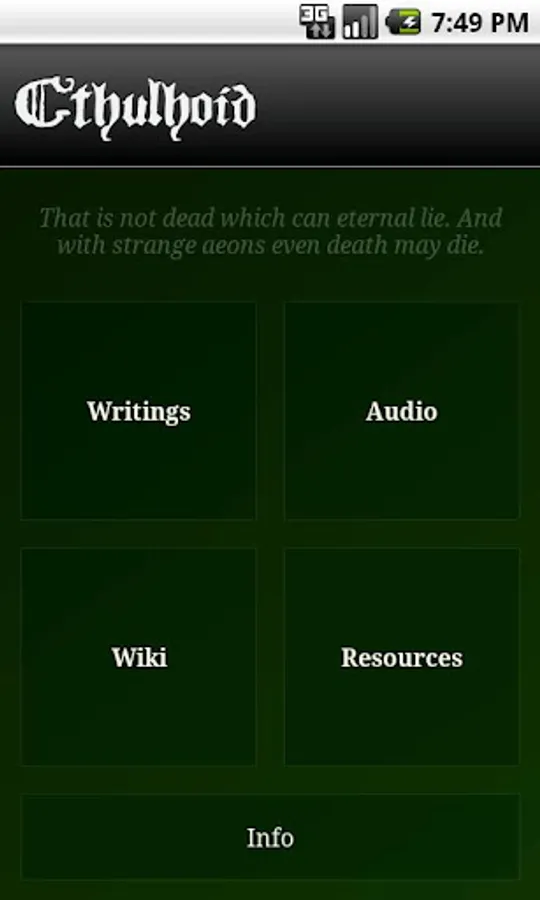 Cthulhoid wants to be your mobile companion for all things related to the Cthulhu Mythos and horror writer H.P. Lovecraft. It contains the complete works of H.P. Lovecraft (except some collaborations), including stories, poetry and essays, as DRM-free eBooks, a directory of publicly available H.P. Lovecraft audiobooks. a categorized index of Wikipedia pages related to the Cthulhu mythos and a detailed timeline of the Cthulhu Mythos. The UI is optimized for phones.