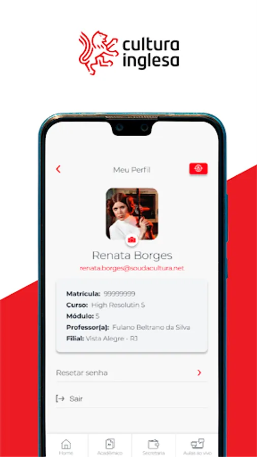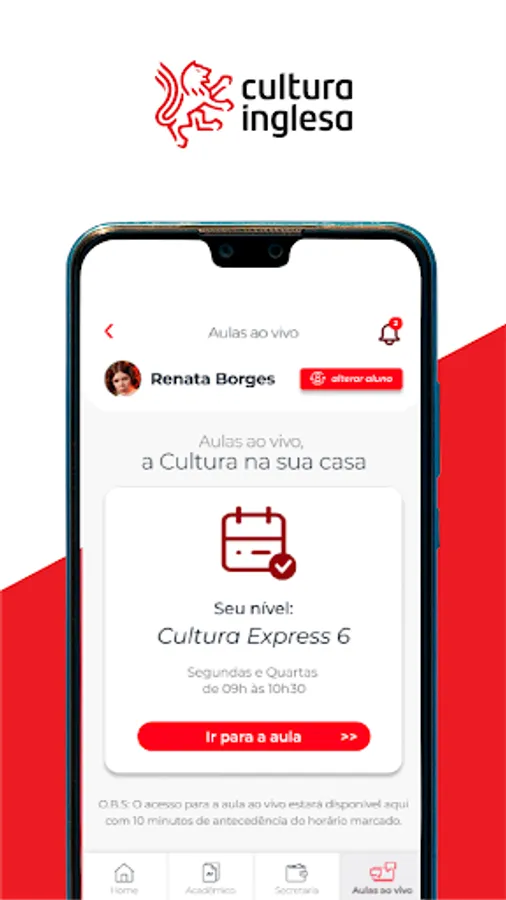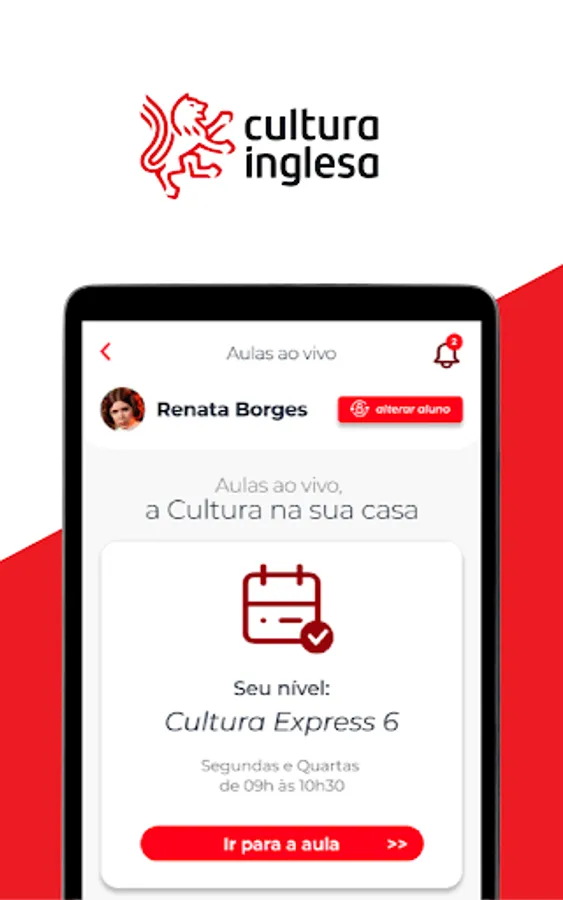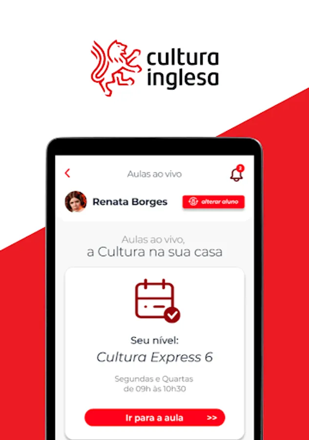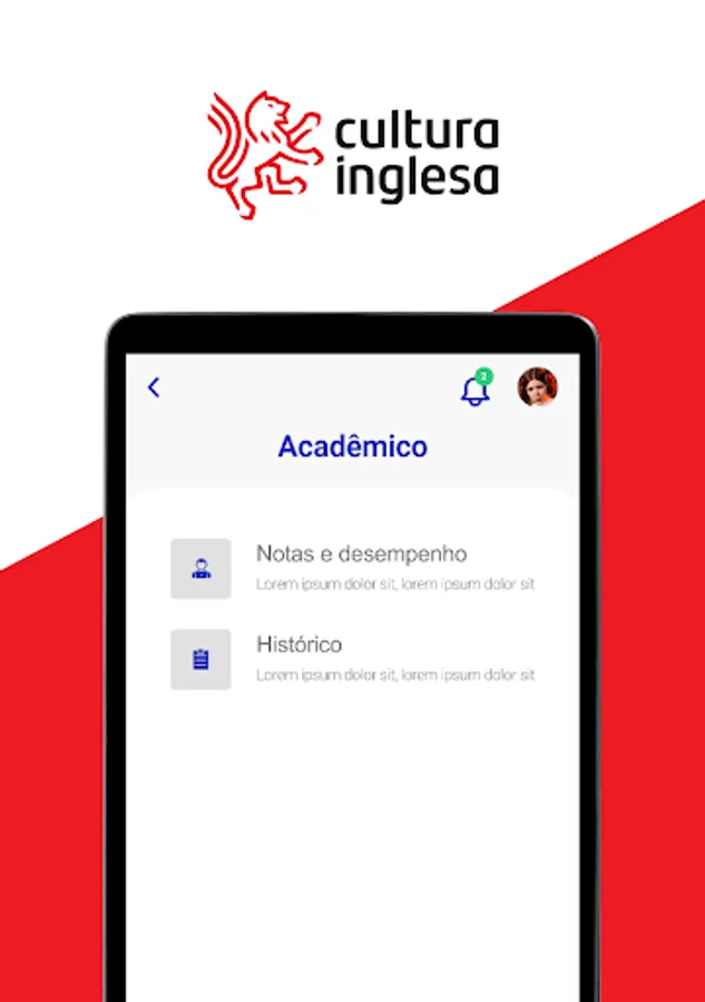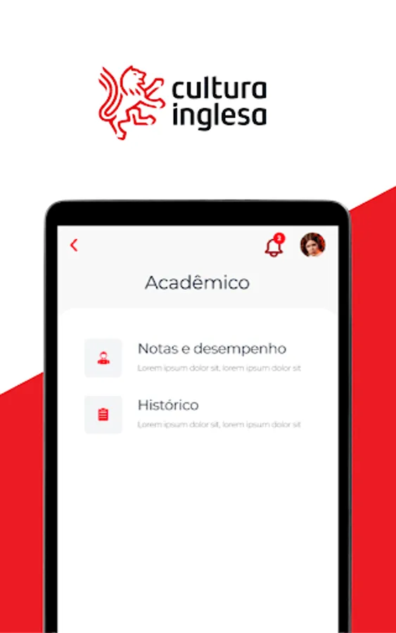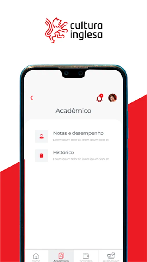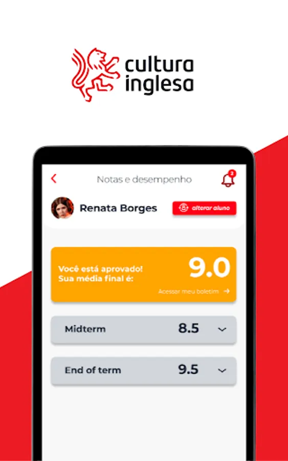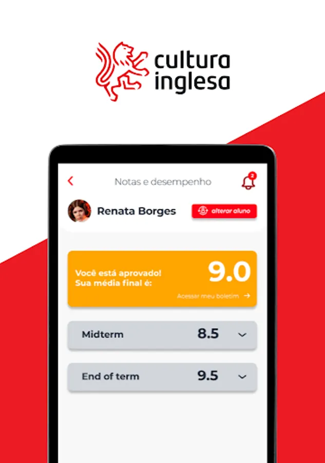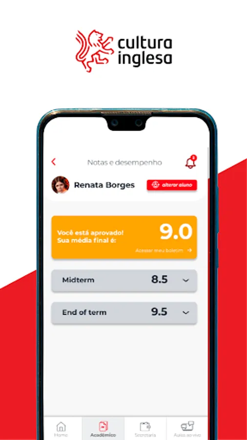 With the Cultura Inglesa app (RJ, RS, GO, ES, DF and TO), students and guardians access communications about the course, monitor grades and attendance, and consult payment history.