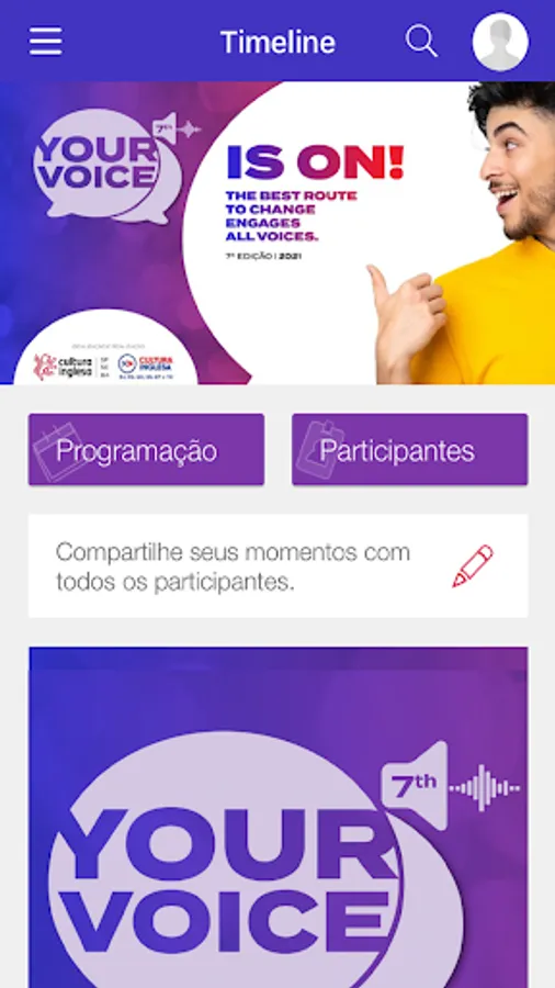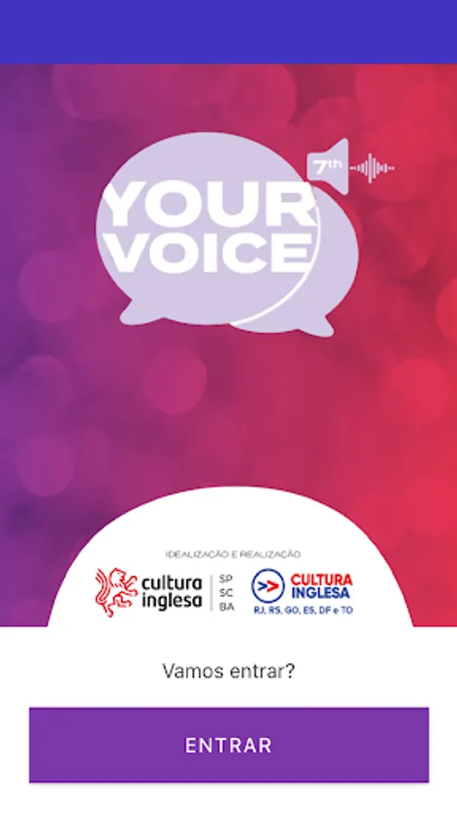 Your Voice is Cultura Inglesa's public speaking cultural contest. Created in 2014, it now arrives in its 7th edition in a fully digital format and with several new features. Use our app! Here you can connect with other candidates and the event organizers, interact with our posts, make your own posts and have access to all information about the contest!