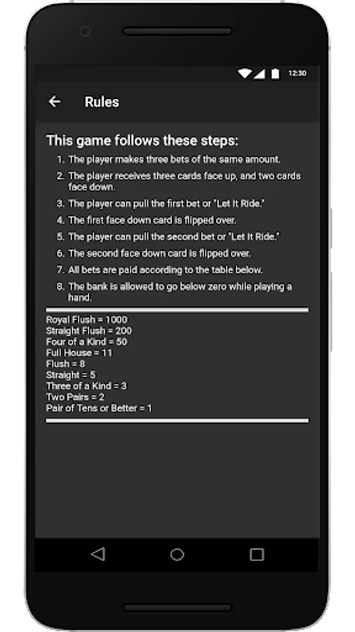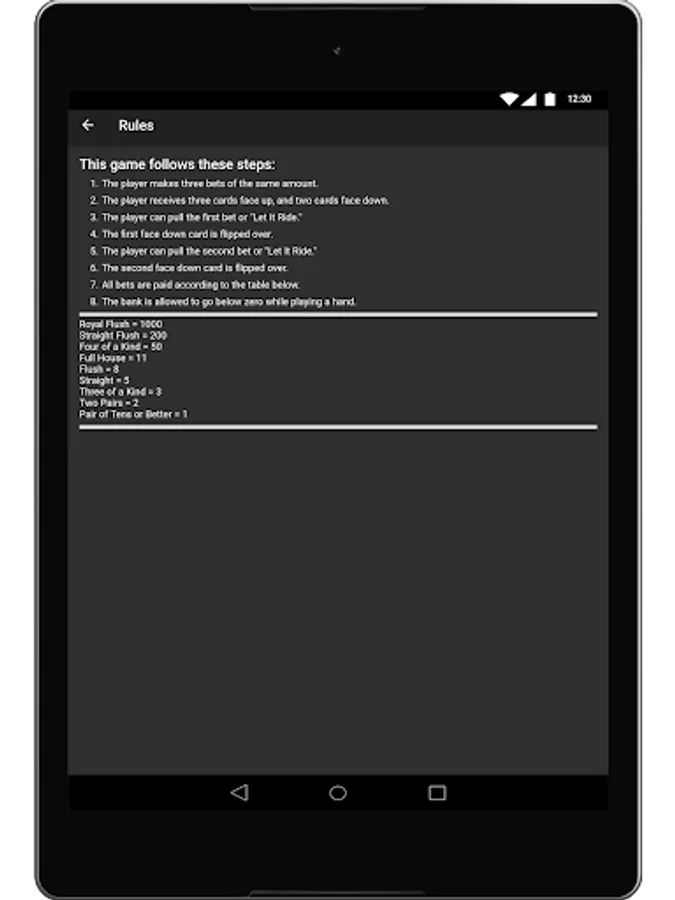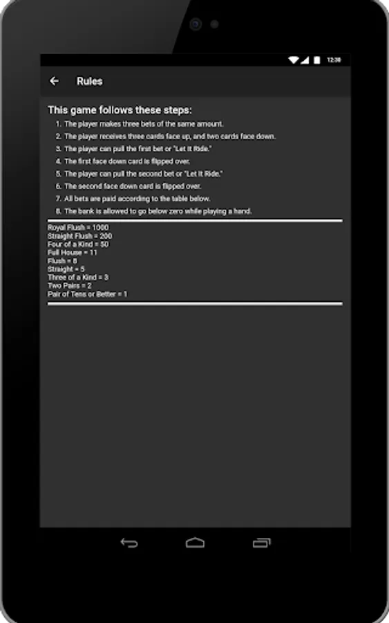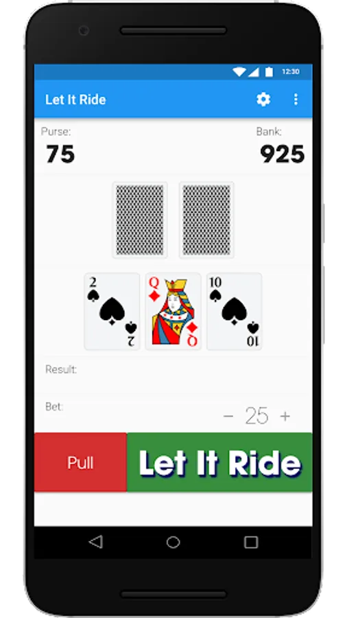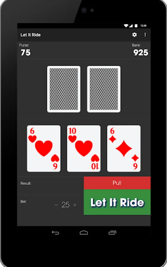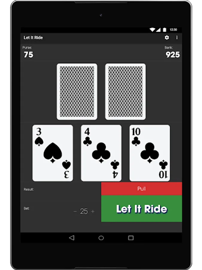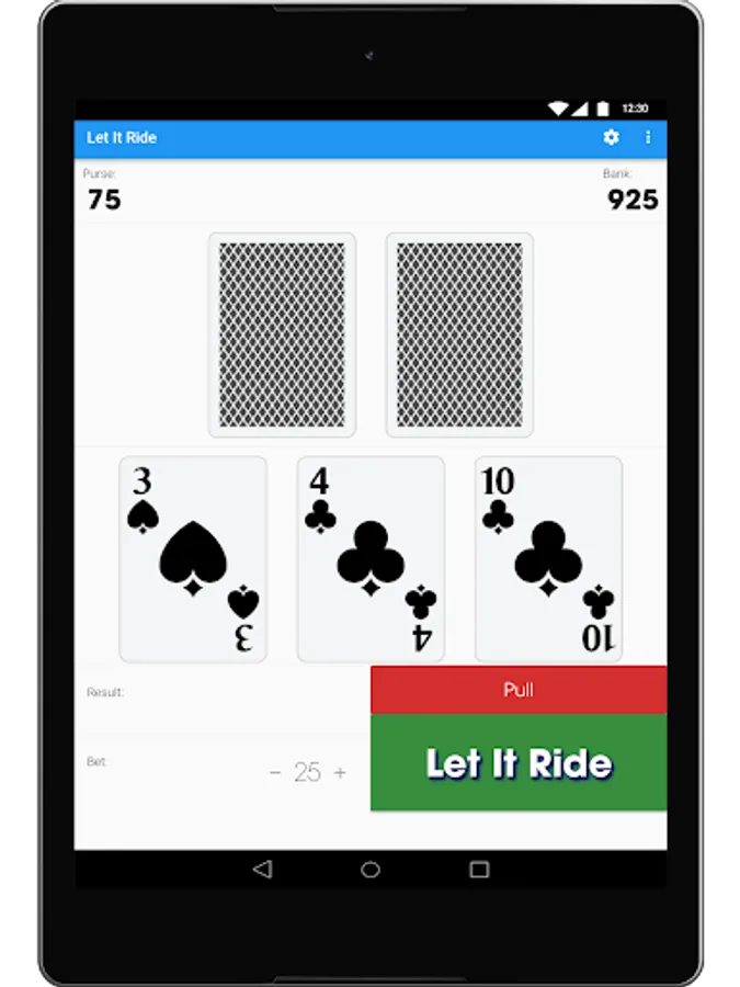 Let It Ride is an easy and fun poker-based card game. A variation of five-card stud, the player is paid based only on the cards in hand. There is no dealer hand to play against. The cards are reveled to the player one by one and the player can adjust the bet based on the cards reveled. The skill is knowing when to adjust the bet and by how much.