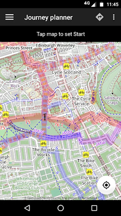 Select a start and finish point, plus intermediate waypoints, by tapping on the map, by searching for names/places/postcodes, or by using your current location, and tap to obtain the route. Uses the general street network, plus Sustrans and other routes.