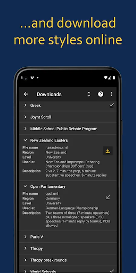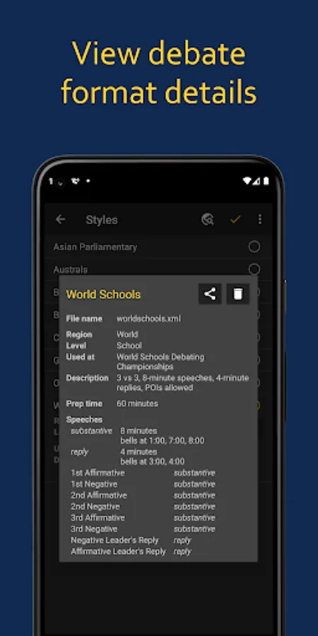 Debatekeeper automatically switches to the appropriate speech time in styles that require it, e.g. those with reply speeches. It supports most parliamentary styles, including British Parliamentary (WUDC), World Schools (WSDC), Australs, American Parliamentary (APDA), Canadian Parliamentary, Asian Parliamentary (UADC), Australian Easters, and New Zealand university styles. More styles can be downloaded in the app from the online repository.
