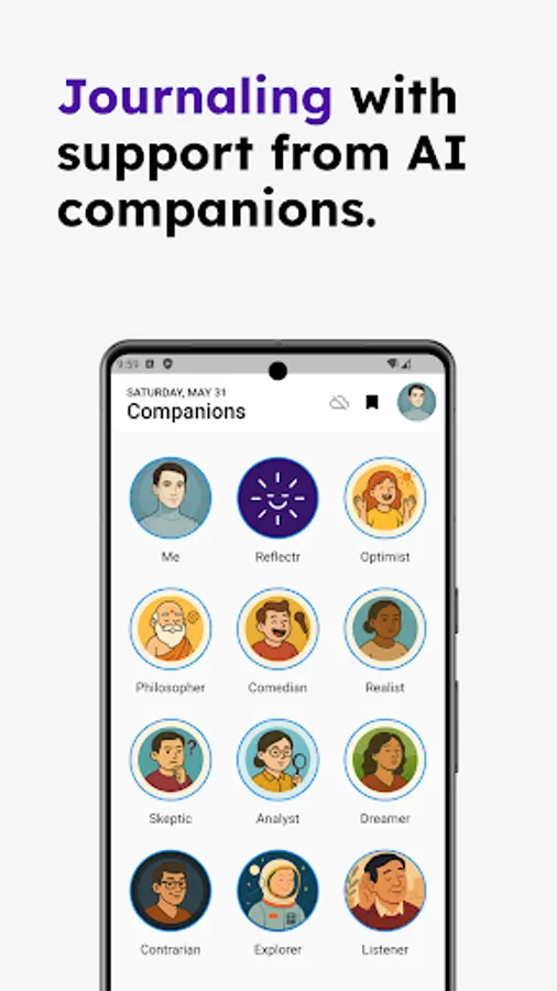 AI personalities: You're not alone in your journaling process. Our personalities will comment on your AI notebook posts and also provide daily and weekly affirmations, recommendations, and motivations. All based on your posts. Choose from AI personalities such as philosopher, optimist, comedian, realist, skeptic, contrarian, analyst, and dreamer.