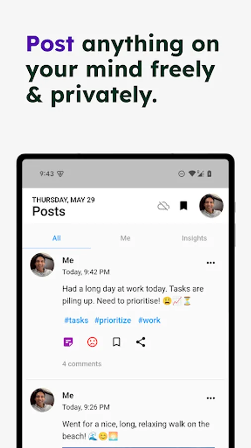 Clear your mind today! Share thoughts, ideas, notes—anything on Reflectr and unleash the power of your mind. Use our amazing journal diary and mood tracker app for free! It's easy and simple to use. Give it a try today!