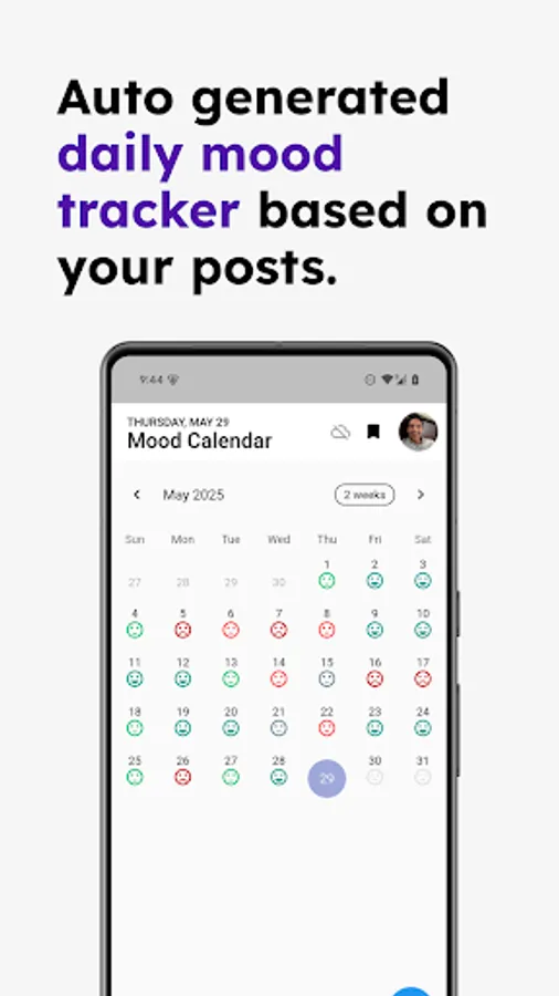 AI-based mood calendar: Write down anything you're thinking about, and at the end of each day, the app will show your mood based on what you wrote. You can see your mood trends on the calendar, giving you a full picture of how you feel each day in your private digital space.
