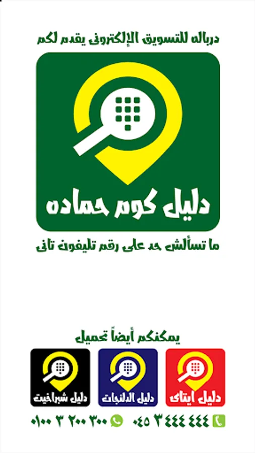 Application Application Directory Com Hamada "Your country in your phone" a small area works without Net All phones divided by professions and easy to download, search, contact and participation There are some details such as address and link Elvis and the guide Minio restaurants and important news and offers and welcome suggestions and is constantly updated Send your name and number and domain to add Watts 01002300300 You can also download (Dalangat directory - Etai guide - Shubrakhit directory) by searching them in Google Play Store - We value 5 stars at the store and share the guide to benefit