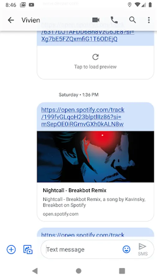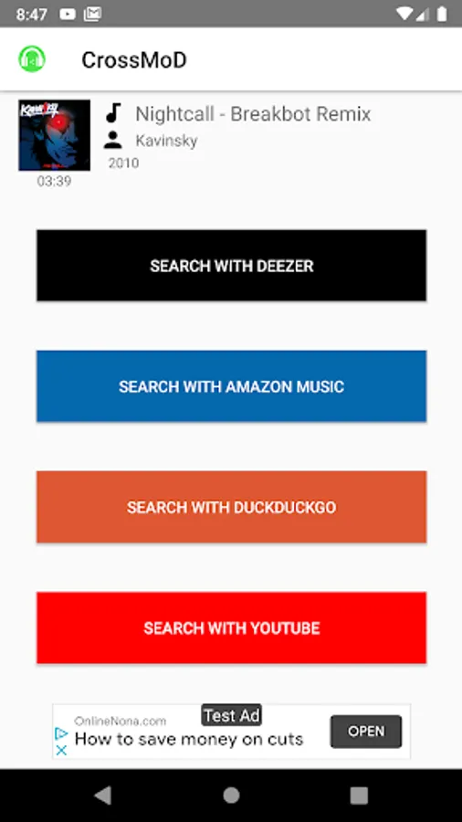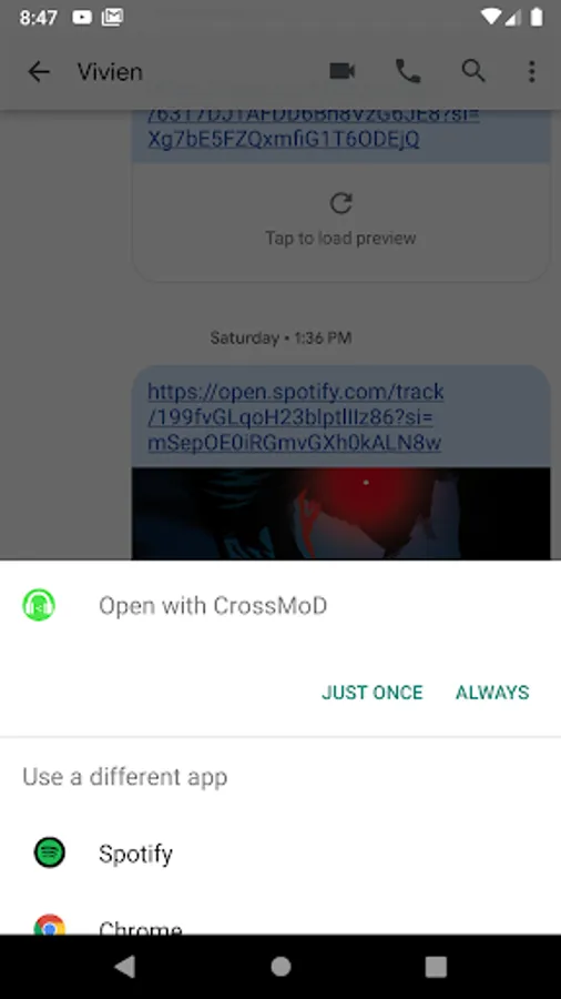 Tap on a link and select CrossMoD to open with, then CrossMoD get track's informations from Spotify et launch a search in the Deezer App with these datas.