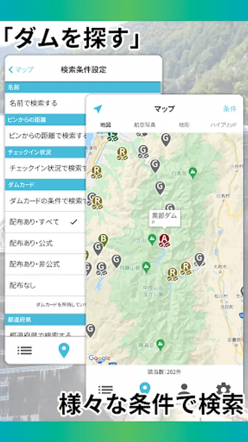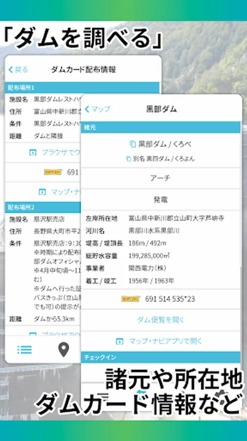 ・ You can search for dams not only by name, but also by distance from your current location, prefecture and type of dam, purpose of the dam, and whether or not a dam card has been distributed.
