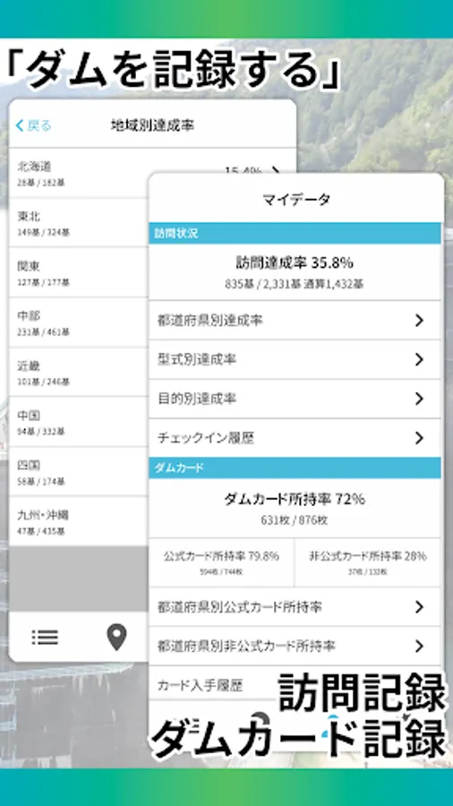 ・ From the check-in record, you can refer to the visit achievement rate by prefecture, dam type, and purpose. Possession rate of dam card.