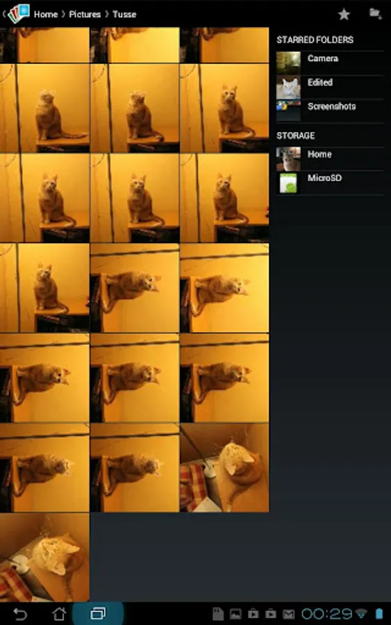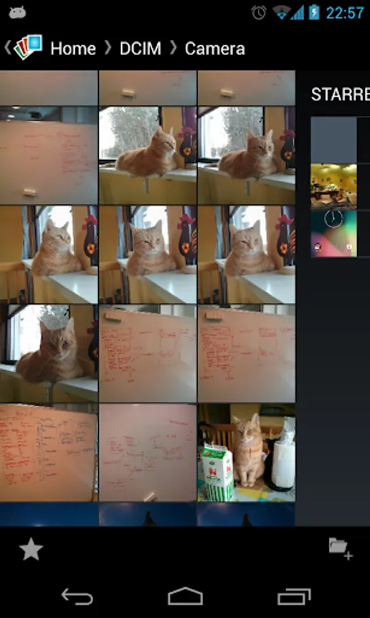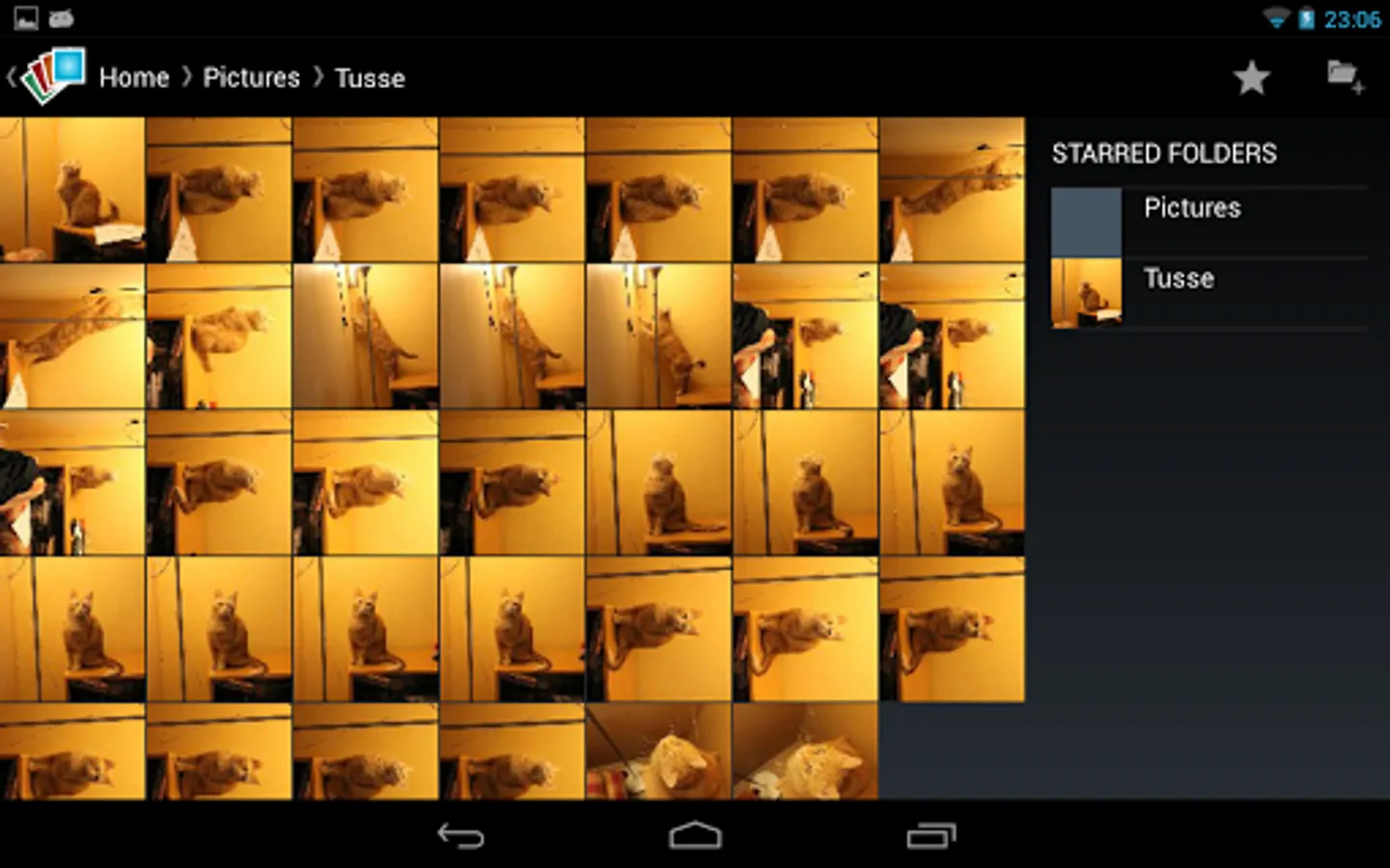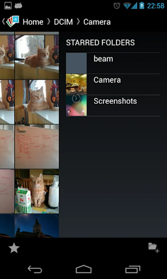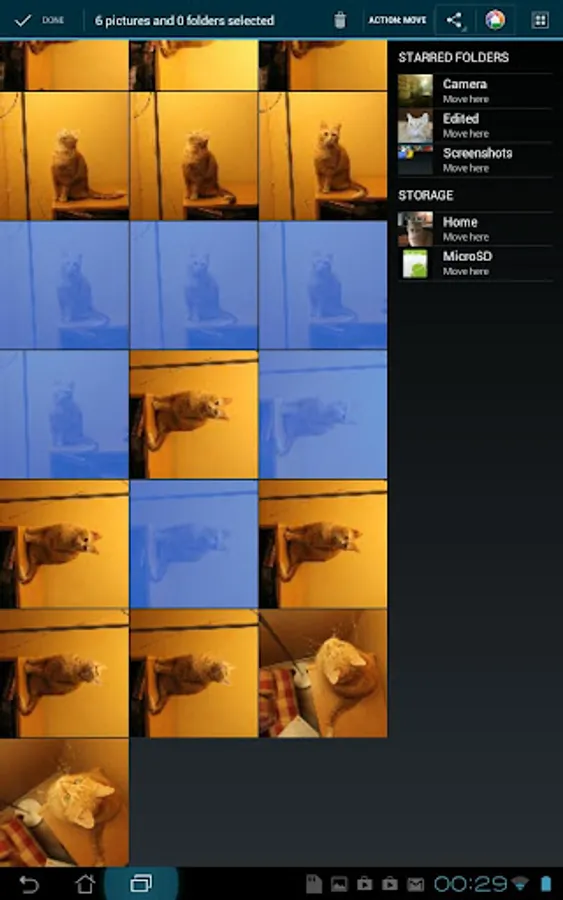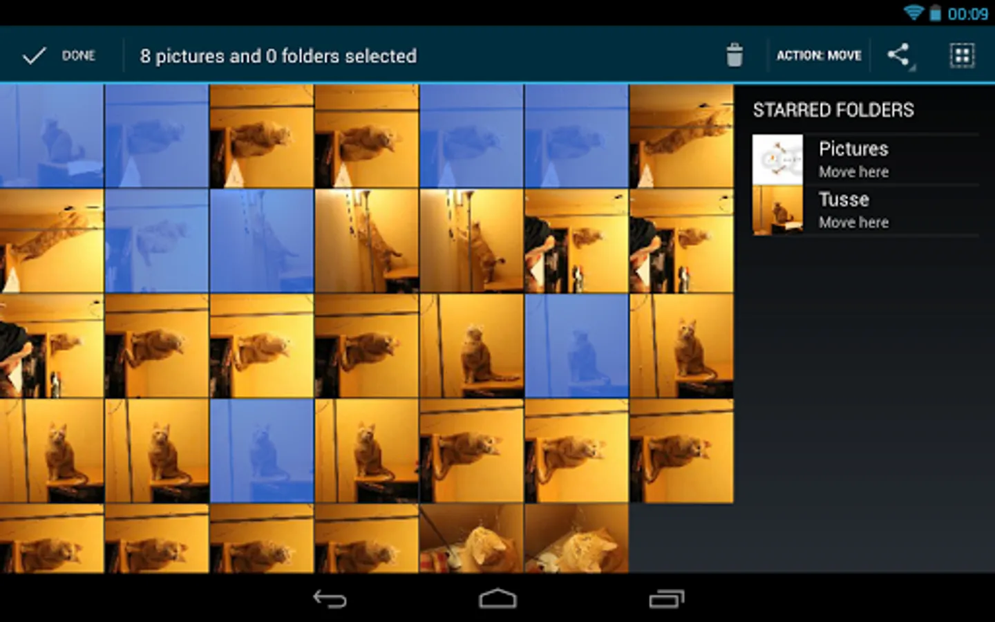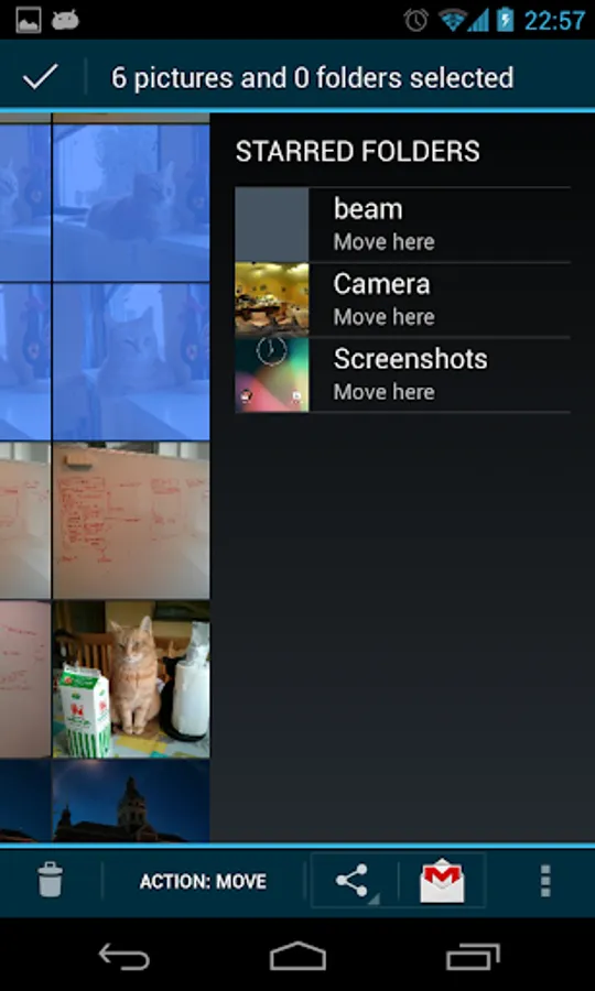 It's made to be as fast as possible in moving pictures between several folders. To the right you have your favorited folders. You add them by going into a folder and press the star button. When long pressing a picture you start the select mode. Then it's just pressing several pictures and click on a folder at the right to move or copy them there. There are also actions for sharing the selected images and removing them.