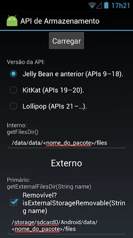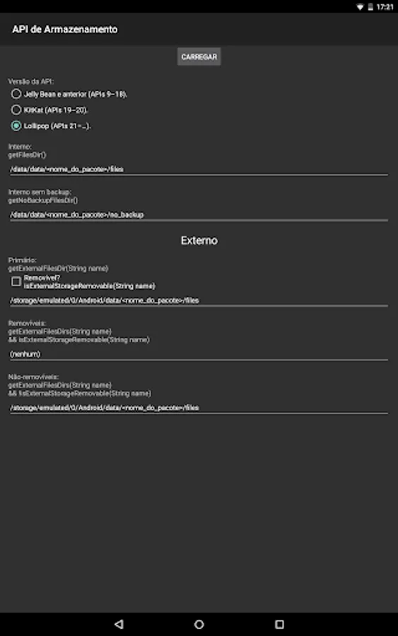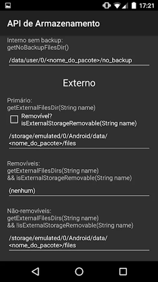 A simple program that shows the storage possibilities offered by the Android API, and how this translates into physical folder paths in the device memory.