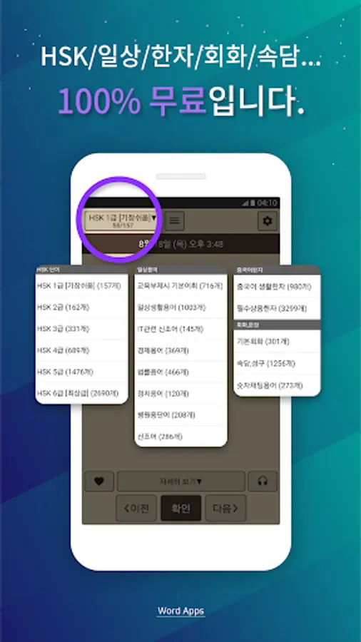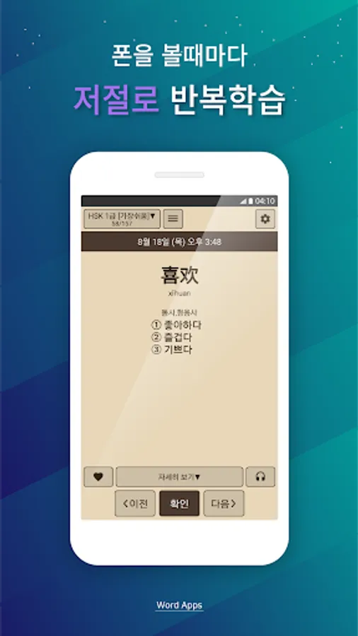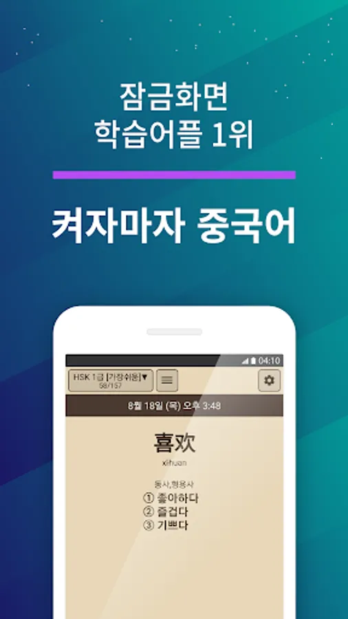 ★ Pinyin (pronunciation) is as simple as a word! You can study in a moment. For complete beginners, it is recommended to listen to the Pinyin pronunciation a few times. It is easy for beginners to learn because it provides accurate voice and Korean pronunciation. (Chinese Pinyin is different from English, so you must know it.)