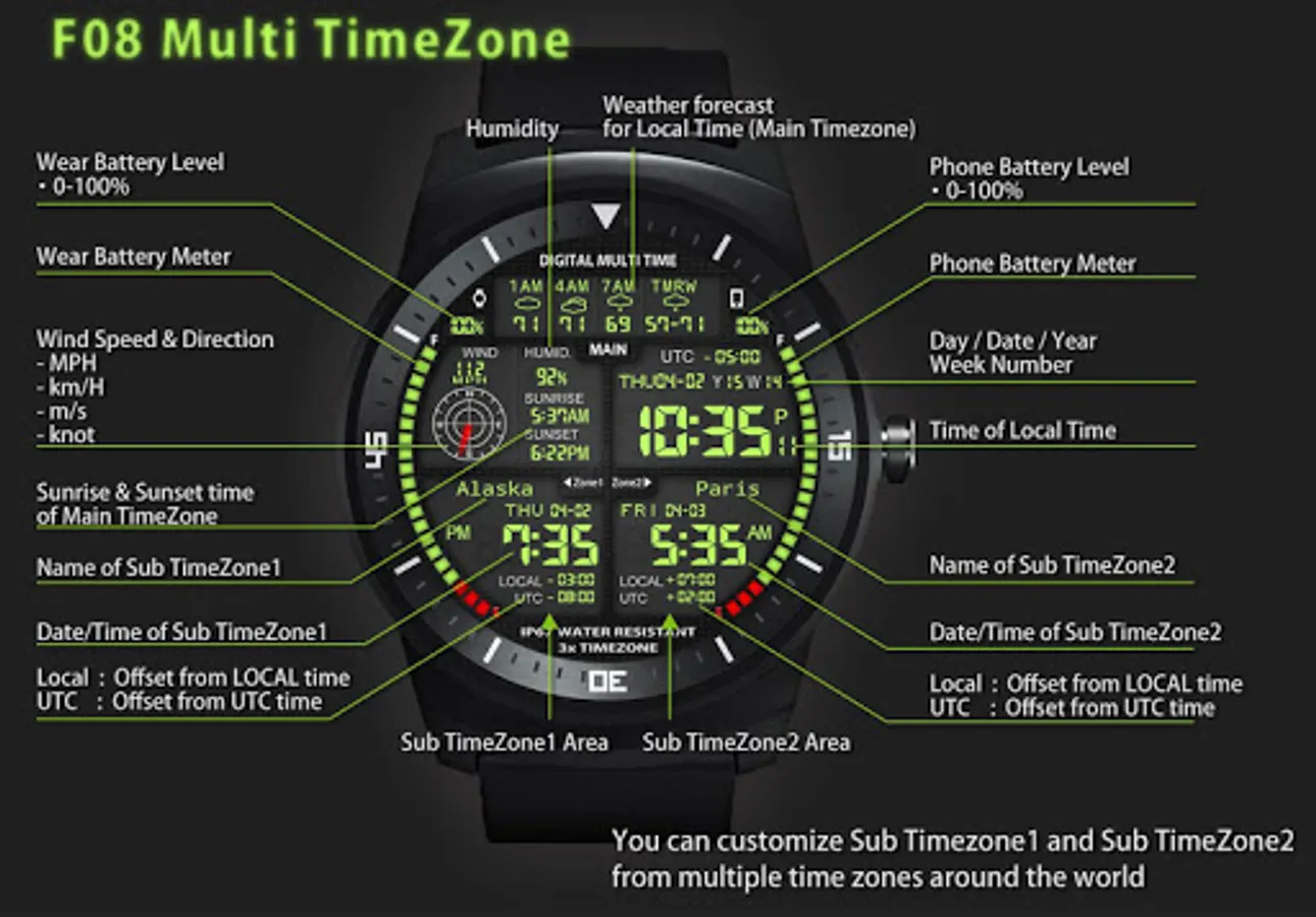 - show 3x time zone , Local time and Sub TimeZone1 and Sub TimeZone2.TimeZone1 and TimeZone2 are customizable.