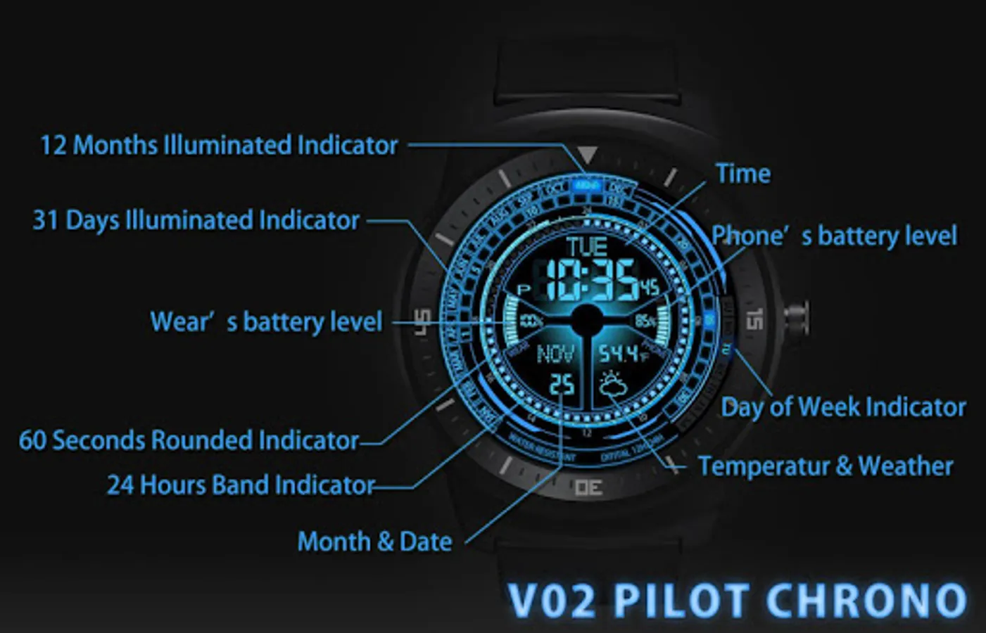 Custom watch face 'PILOT CHRONO' for Round Wear like LG Watch Style / Sport / Asus ZenWatch 3 / Huawei Watch 2 /NIXON THE MISSION / HUAWEI Watch / CASIO Pro Trek / Q Founder / Smart Watch3 / Polar M600 / TAG Heuer Connected