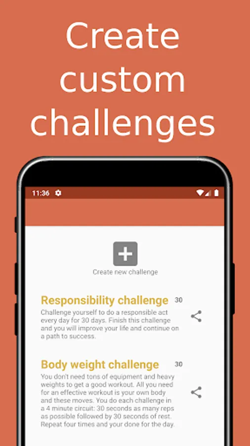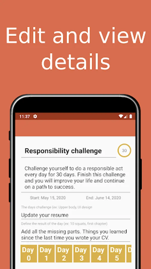 Dailey gives you the ability to start and track your own 30, 60 or 90 challenges. You can define what you would like to do each day of the challenge and have the app guide you through the challenge.