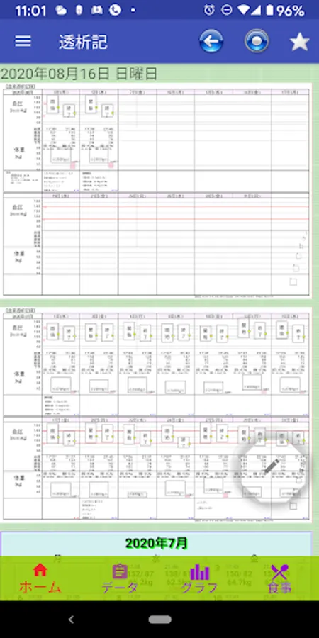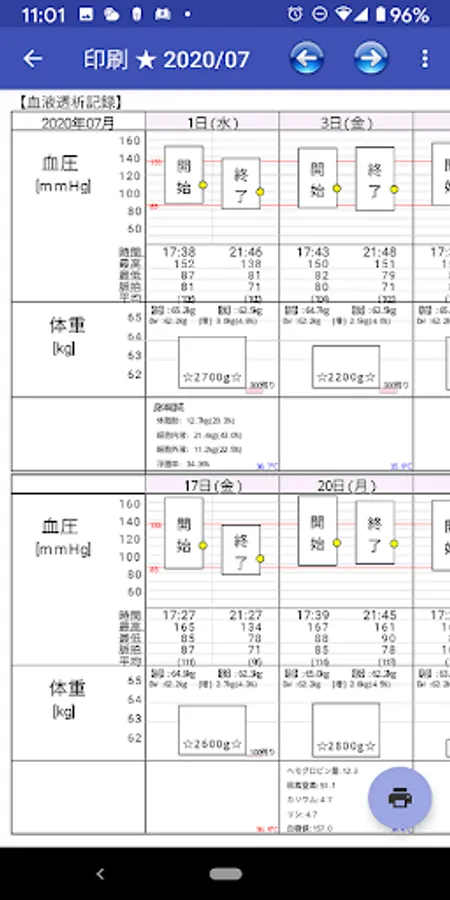 Records of blood pressure, body weight, water removal, and body temperature during dialysis. ‥