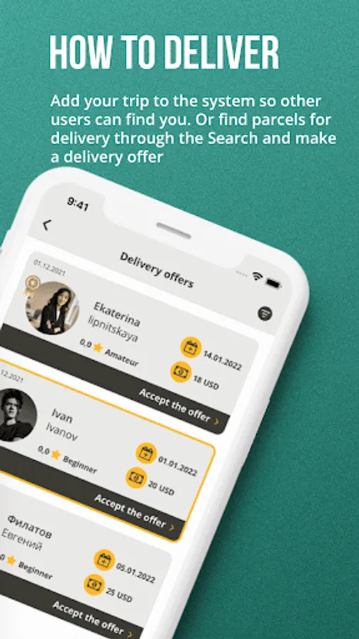 HOW TO DELIVERY. Add your route to "Trips", specify the parameters of the parcels you are willing to take with you, and the system will automatically select the right parcels for you for delivery. Make a delivery offer, specifying the date and cost of your services.