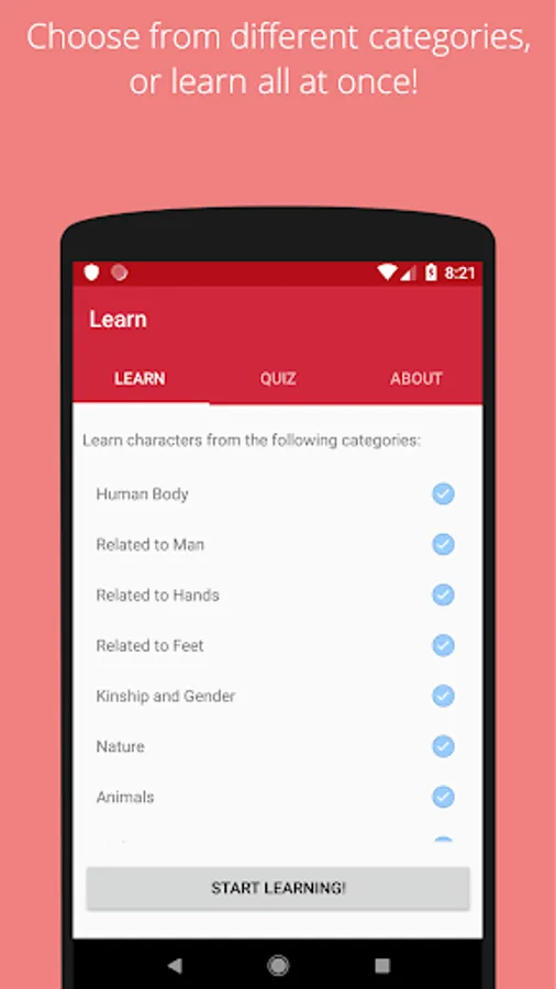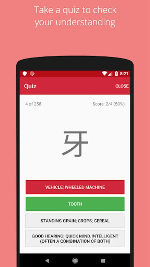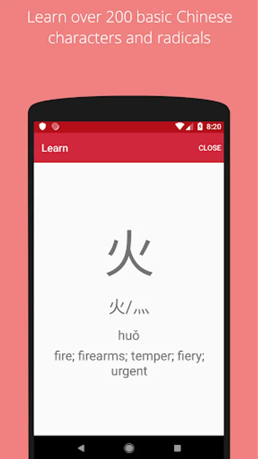 Swipe through 200+ basic Chinese characters, their radicals and the Pinyin pronunciation and English meaning.