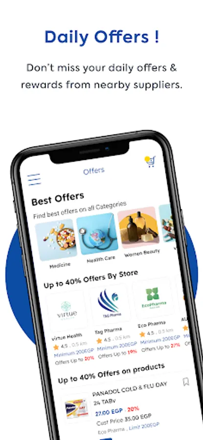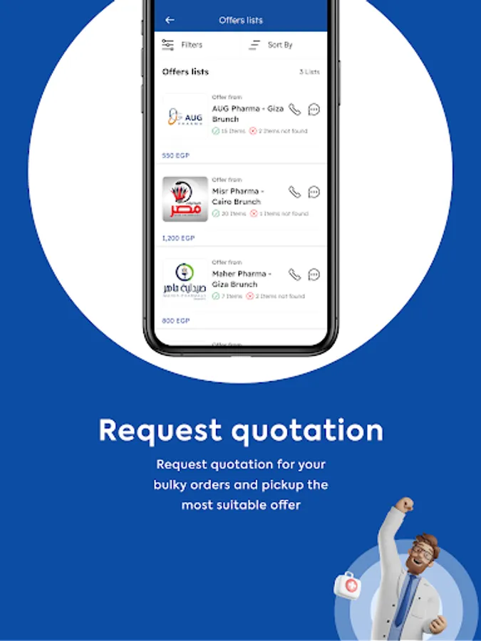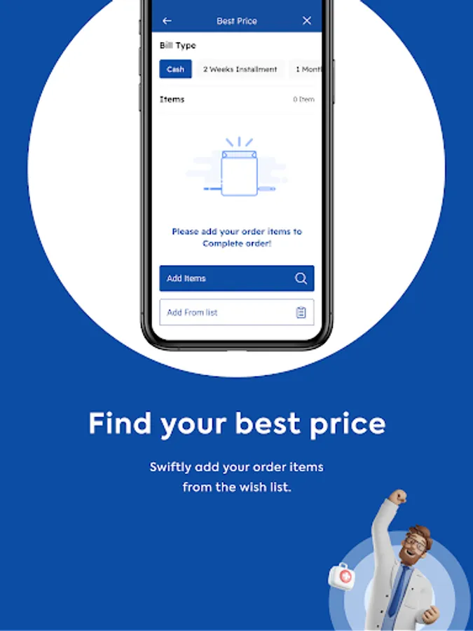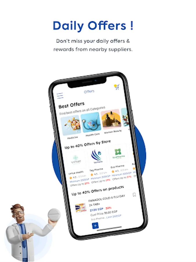 The app allows pharmacy staff to order needed medicines, cosmetics, and medical supplies from stores with the highest discount rate.