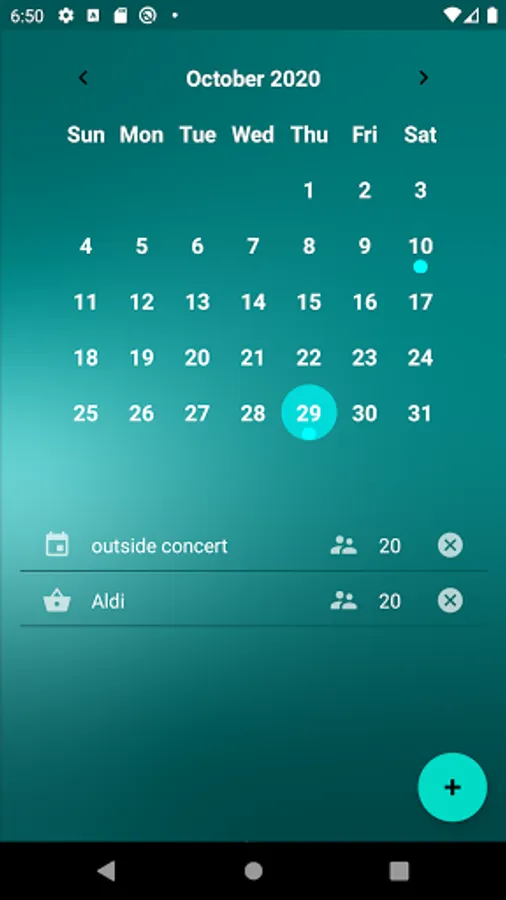 For each day, several events with a short description, a type (shopping/meeting/misc) and the number of contacts and their names can be entered.