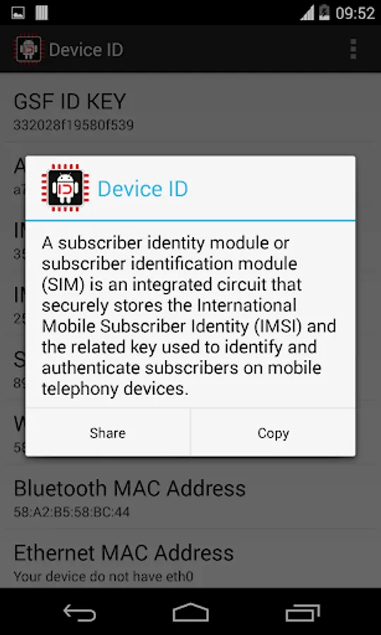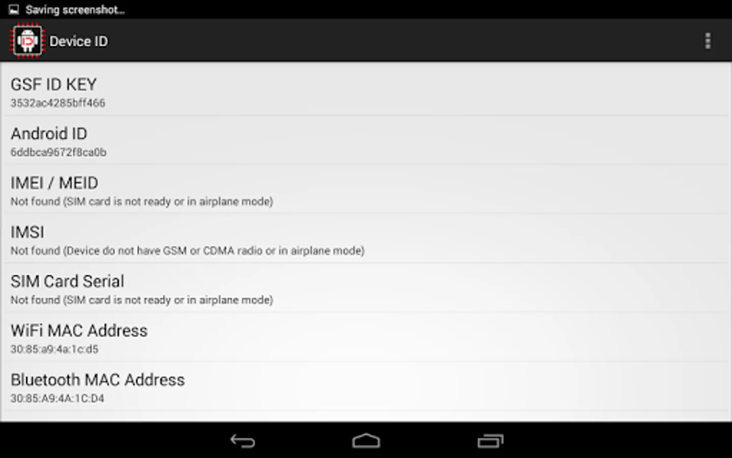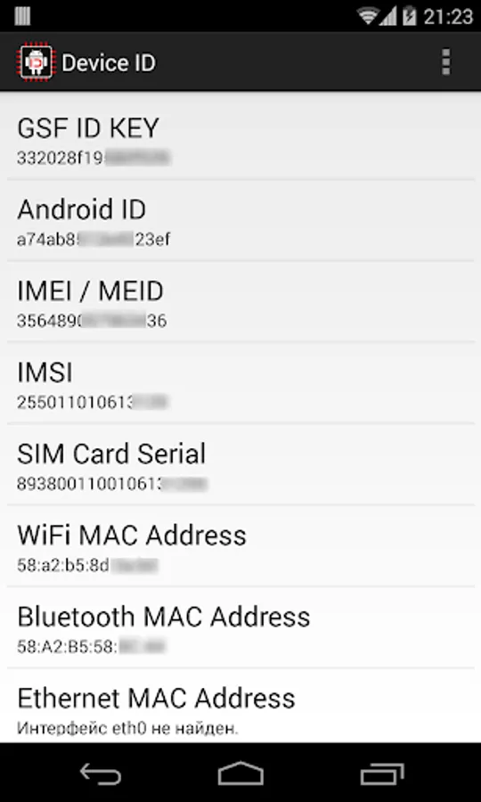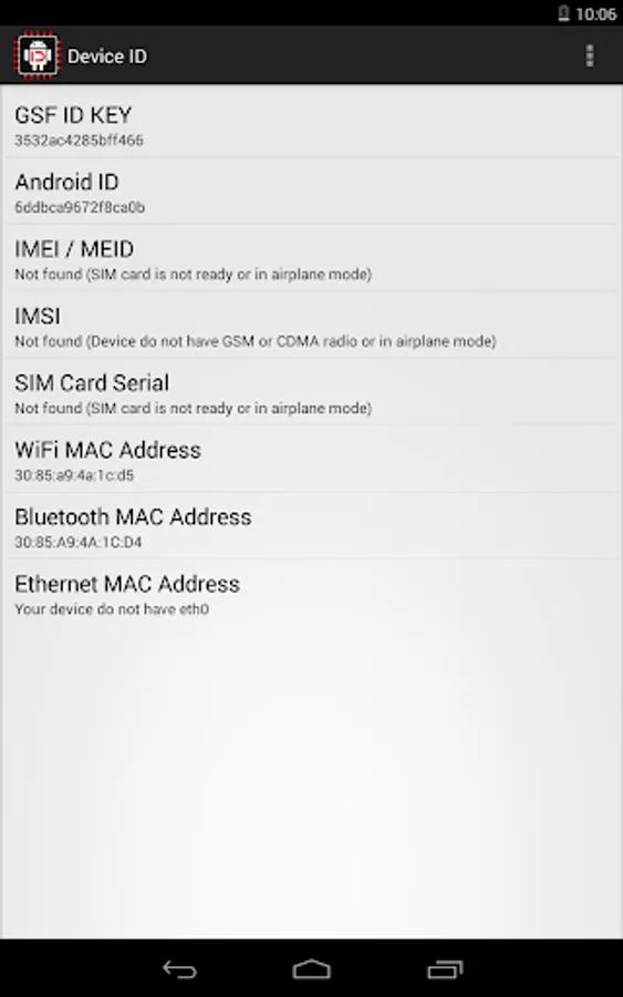 Simple app to get your Device ID/Android ID ,Google Services Framework ID, IMEI / MEID, Subscriber ID (IMSI), SIM Card Serial, WiFi MAC Address, Bluetooth MAC Address and Ethernet MAC Address that allow you easily copy and share the ID of your mobile device.