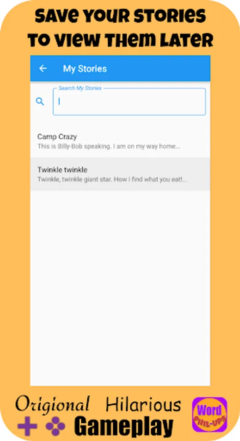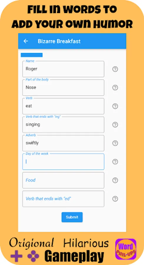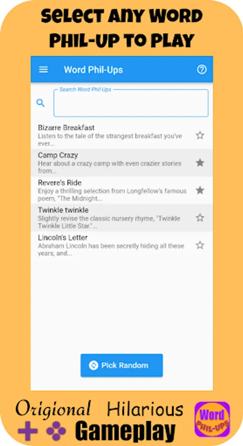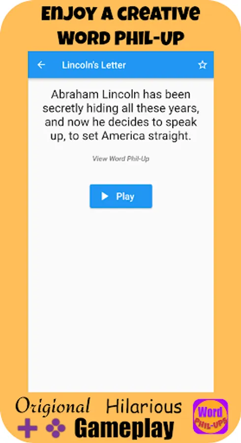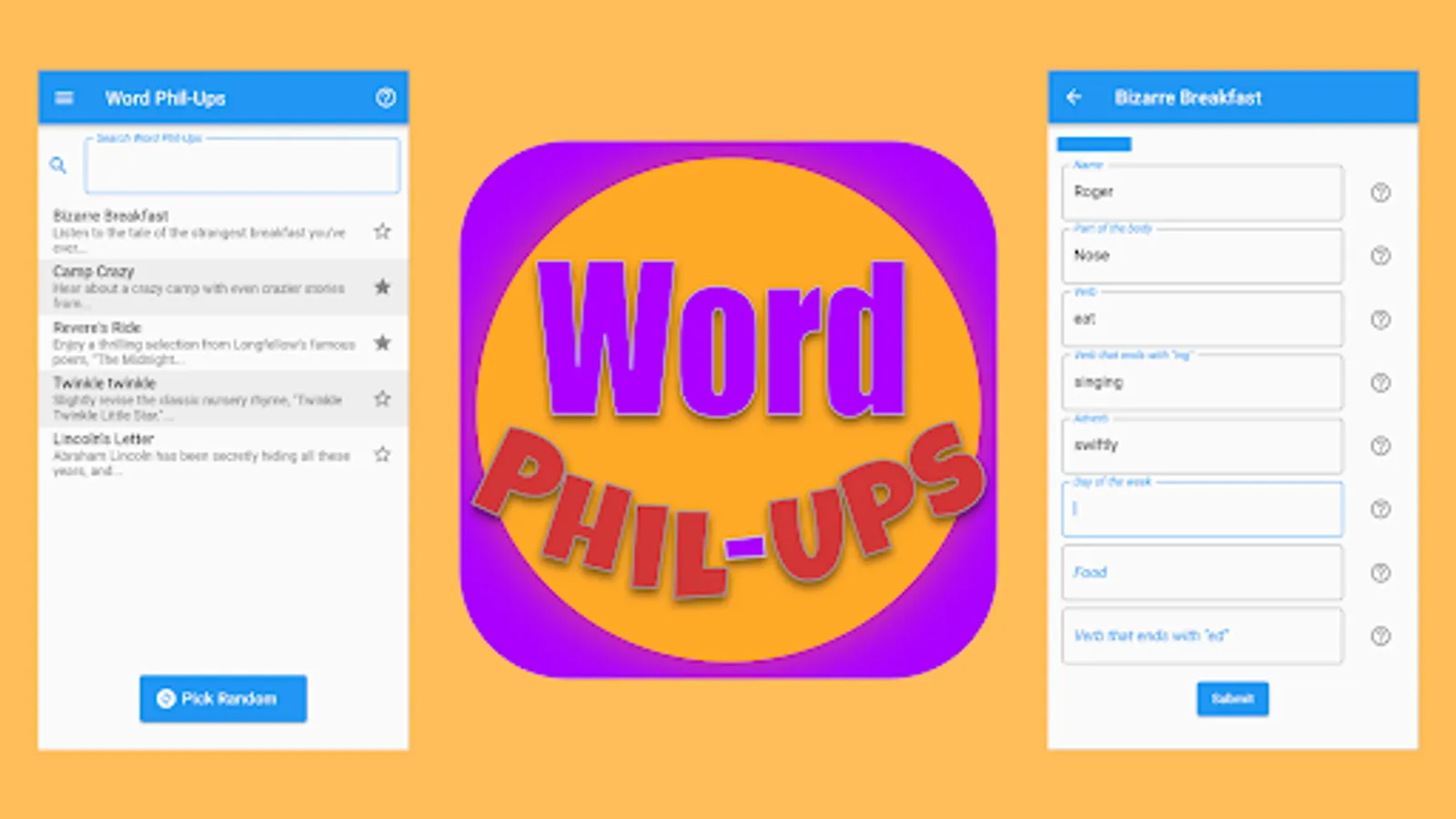 Word Phil-Ups is a fun, leisurely game for playing word phil-ups, which are just funny, word games similar to madlibs. Word Phil-Ups allows you to play word phil-ups, without disruption, personalize your theme color, save your stories, and much more.