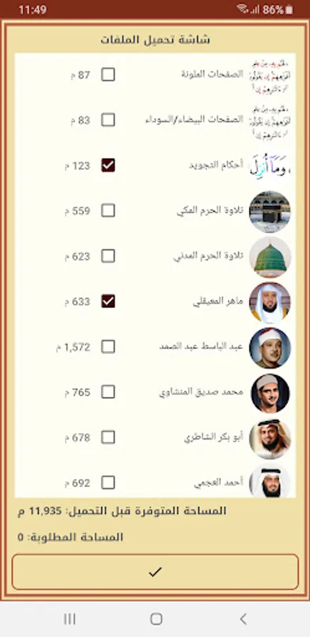 • Recitation of the verses with the various voices of famous reciters (20 reciters).