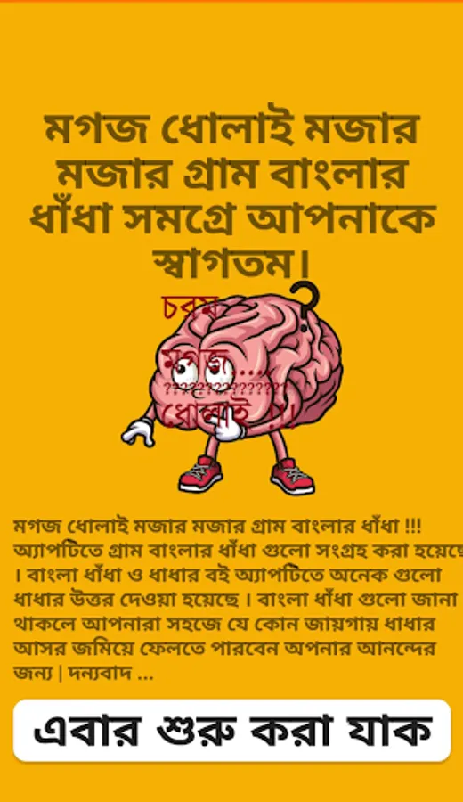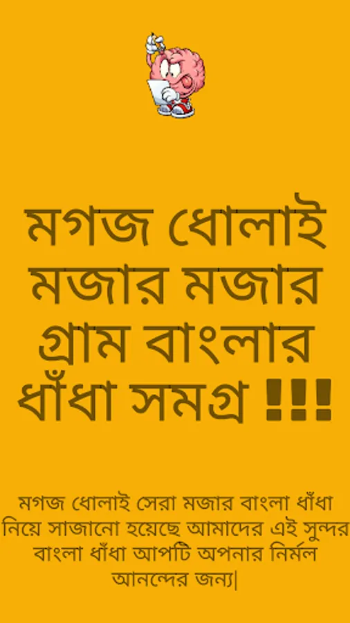 MOGOZ DHOLAI BANGLA DHADHA: মগজ ধোলাই মজার মজার গ্রাম বাংলার ধাঁধা। বন্ধুদের আড্ডা মানেই গান, কৌতুক, হাসি-তামাশায় সময় কাটানো। কিন্তু এই আড্ডার মাঝেই যদি একটু বুদ্ধির লড়াই হয়ে যায়, তাহলে সময়টা হয়ে ওঠে আরো উপভোগ্য। আর বুদ্ধির লড়াইয়ে বন্ধুদের হারিয়ে দিয়ে হয়ে ওঠো আড্ডার মধ্যমণি। বাংলা ধাঁধা অ্যাপটিতে গ্রাম বাংলার ধাঁধা গুলো সংগ্রহ করা হয়েছে । বাংলা ধাঁধা ও ধাধার বই অ্যাপটিতে অনেক গুলো ধাধার উত্তর দেওয়া হয়েছে ।