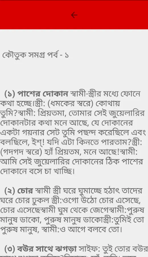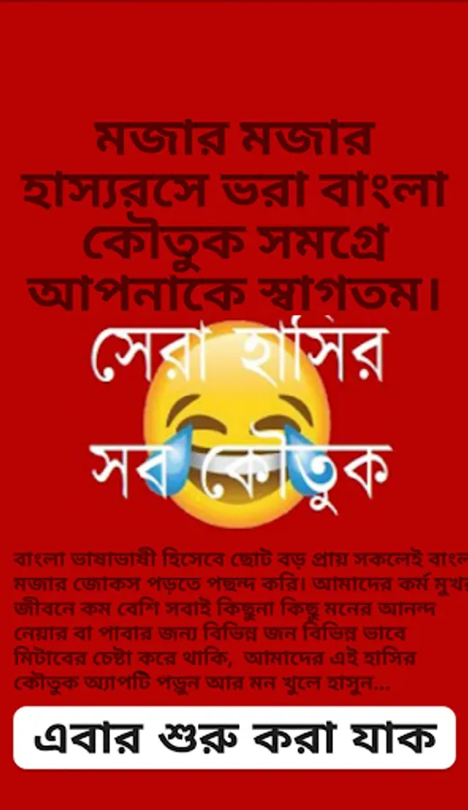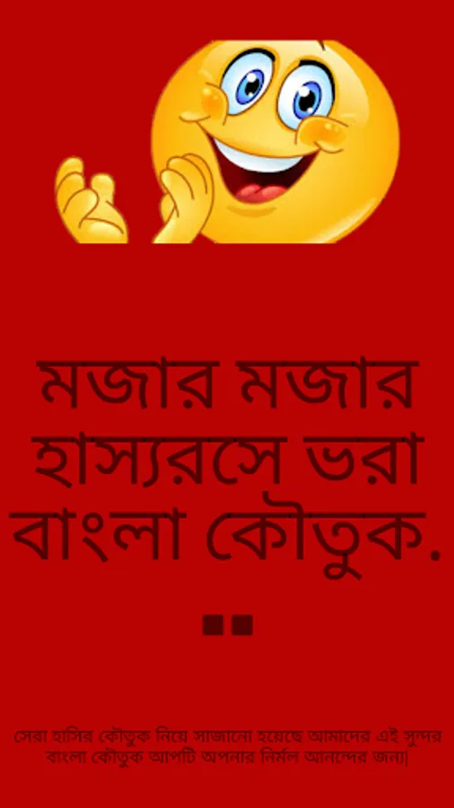 MOJAR JOKES: কি করে মন ভাল করবেন বুজতেছেন না ! মজার মজার হাস্যরসে ভরা বাংলা কৌতুক সমগ্রে আপনাকে স্বাগতম। সেরা হাসির কৌতুক নিয়ে সাজানো হয়েছে আমাদের এই সুন্দর বাংলা কৌতুক আপটি। আজ থেকে আর জোকস বা কৌতুক খুঁজতে হবে না, অ্যাপটি সংগ্রহ করে রাখুন। বাংলা ভাষাভাষী হিসেবে ছোট বড় প্রায় সকলেই বাংলা মজার জোকস পড়তে পছন্দ করি। আমাদের কর্ম মুখর জীবনে কম বেশি সবাই কিছুনা কিছু মনের আনন্দ নেয়ার বা পাবার জন্য বিভিন্ন জন বিভিন্ন ভাবে মেটানোর চেষ্টা করে থাকি, আমাদের এই হাসির কৌতুক অ্যাপটি পড়ুন আর মন খুলে হাসুন... । আপটি ভালো লাগলে কমেন্টস, লাইক, সেয়ার করুন এবং ফাইভ স্টার রেটিং আর জন্য অনুরোধ রইলো । ধন্যবাদ সবাইকে আমাদের সাথে থাকার জন্য।