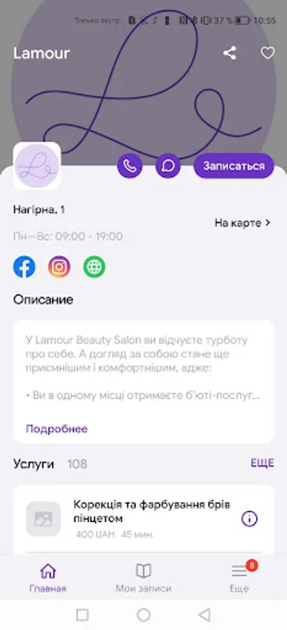 - get acquainted with detailed information about our salon (address indicating the route on the map, work schedule, contacts, list of services indicating cost and duration, photos of the interior, examples of the work of masters, reviews);