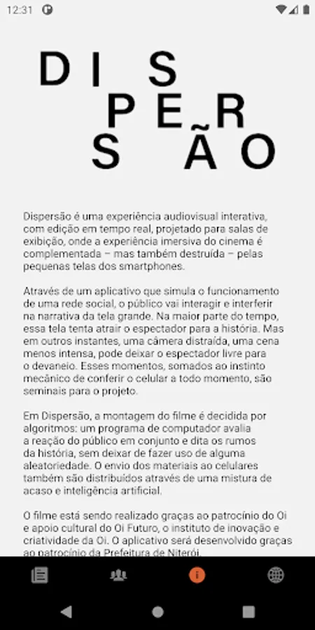 Dispersion is an interactive fictional film for movie theaters, where the audience directs the narrative according to their reactions to the posts on the app. The project has Malu Galli and João Pedro Zappa in the cast and is directed by Bruno Vianna, sponsored by Oi, the Secretariat of Culture of Rio de Janeiro, and the Municipal Secretary of Culture of Niterói.