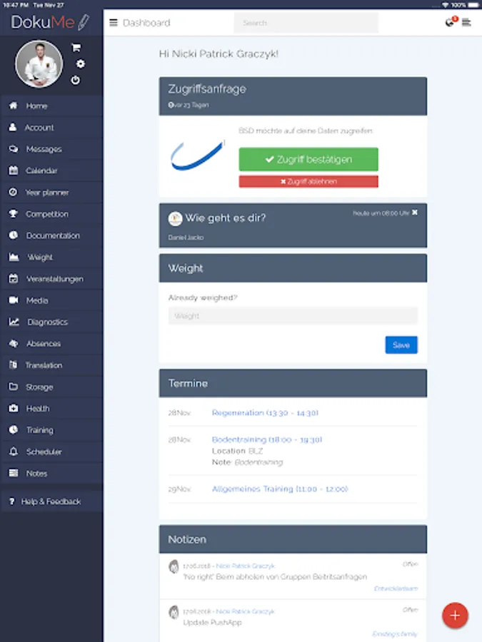 The DokuMe platform always and everywhere as an app. Experience data protection-compliant and innovative digitization in your team, e.g. internal communication with your colleagues in your organization or your team in a sports club: With DokuMe you have the ideal tool to be networked. Regardless of whether you are an athlete and trainer in sport or a colleague in a team: you have all the important apps from the DokuMe universe quickly and easily available.
