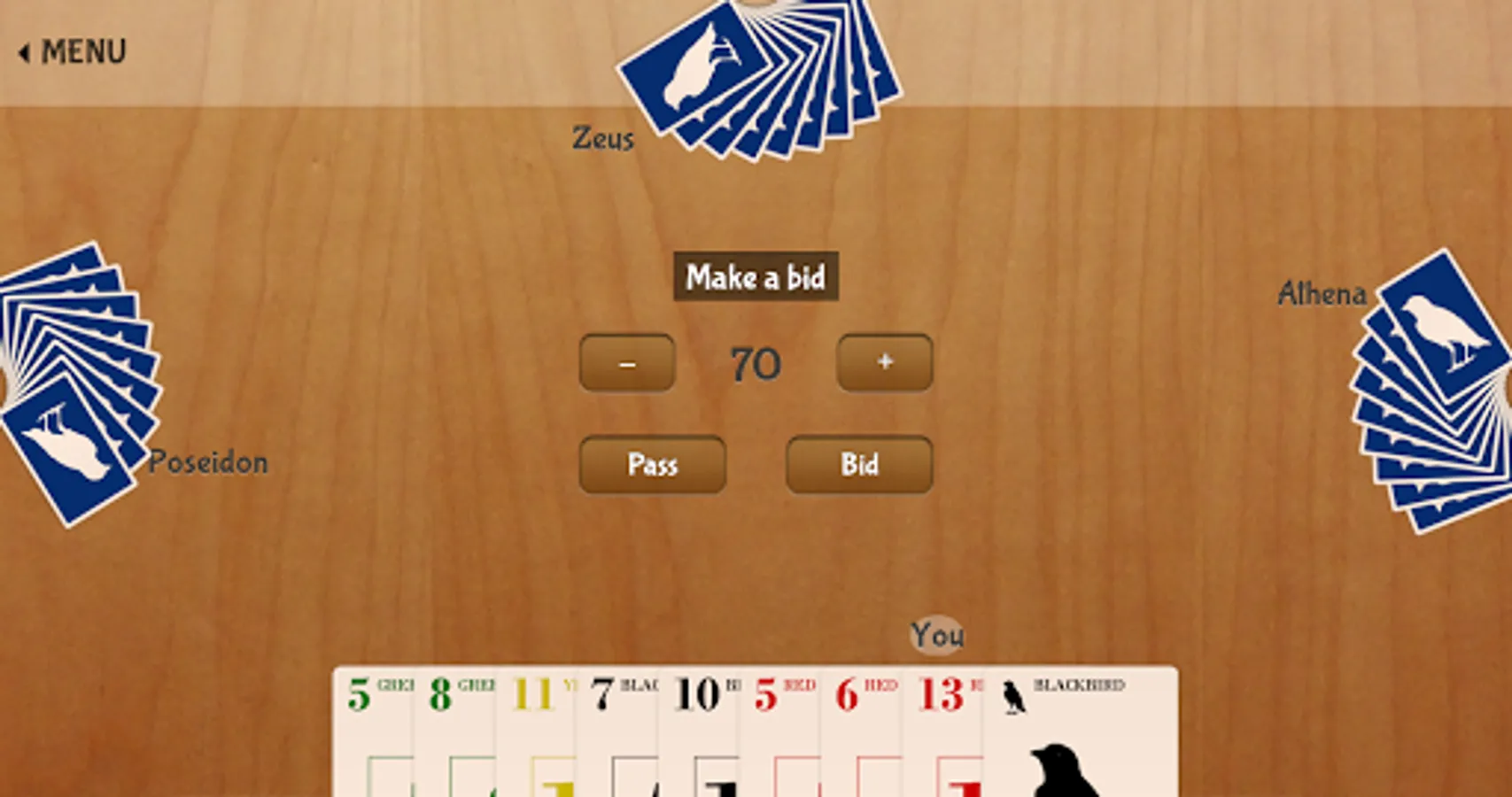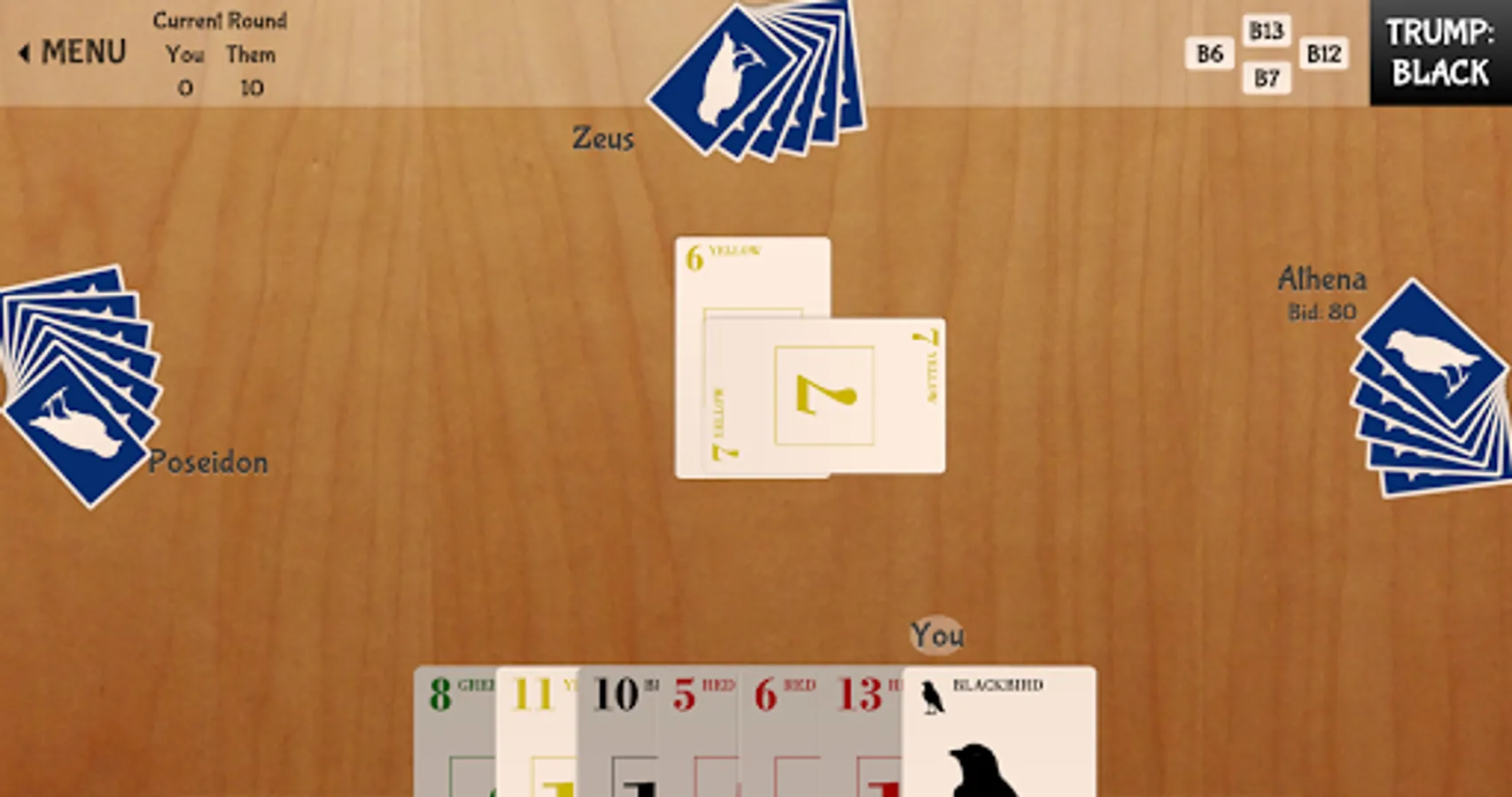 Compete against the computer in this classic trick-taking game. Bid competitively for the chance to declare trump. Take tricks with pointers to reach your bid or you’ll get set!