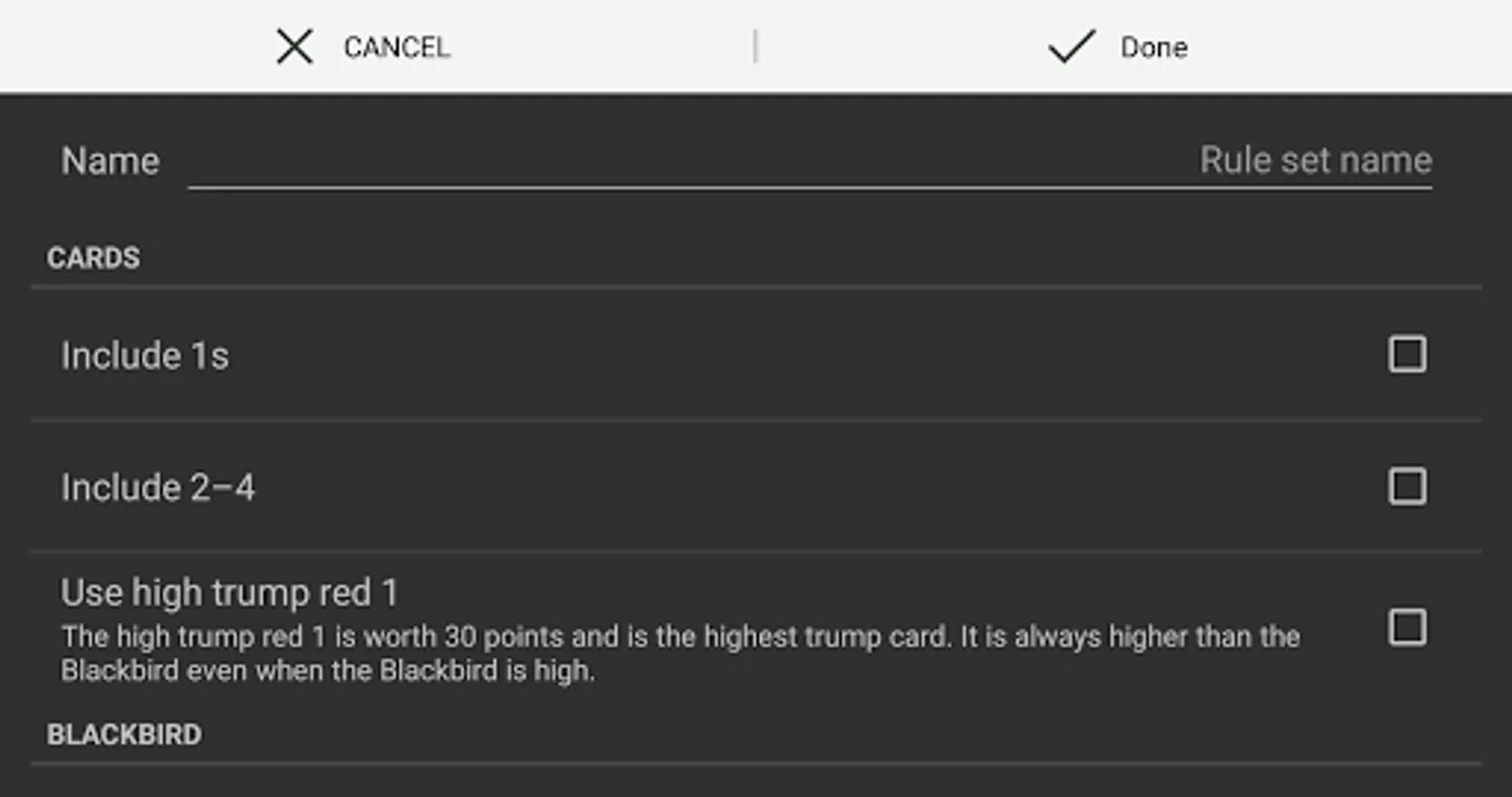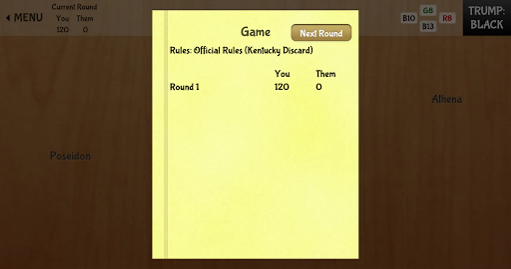 Play with two widely different rule sets (Kentucky Discard or Western Wyoming) or create your own set of rules to play with any of these options that can be on or off: